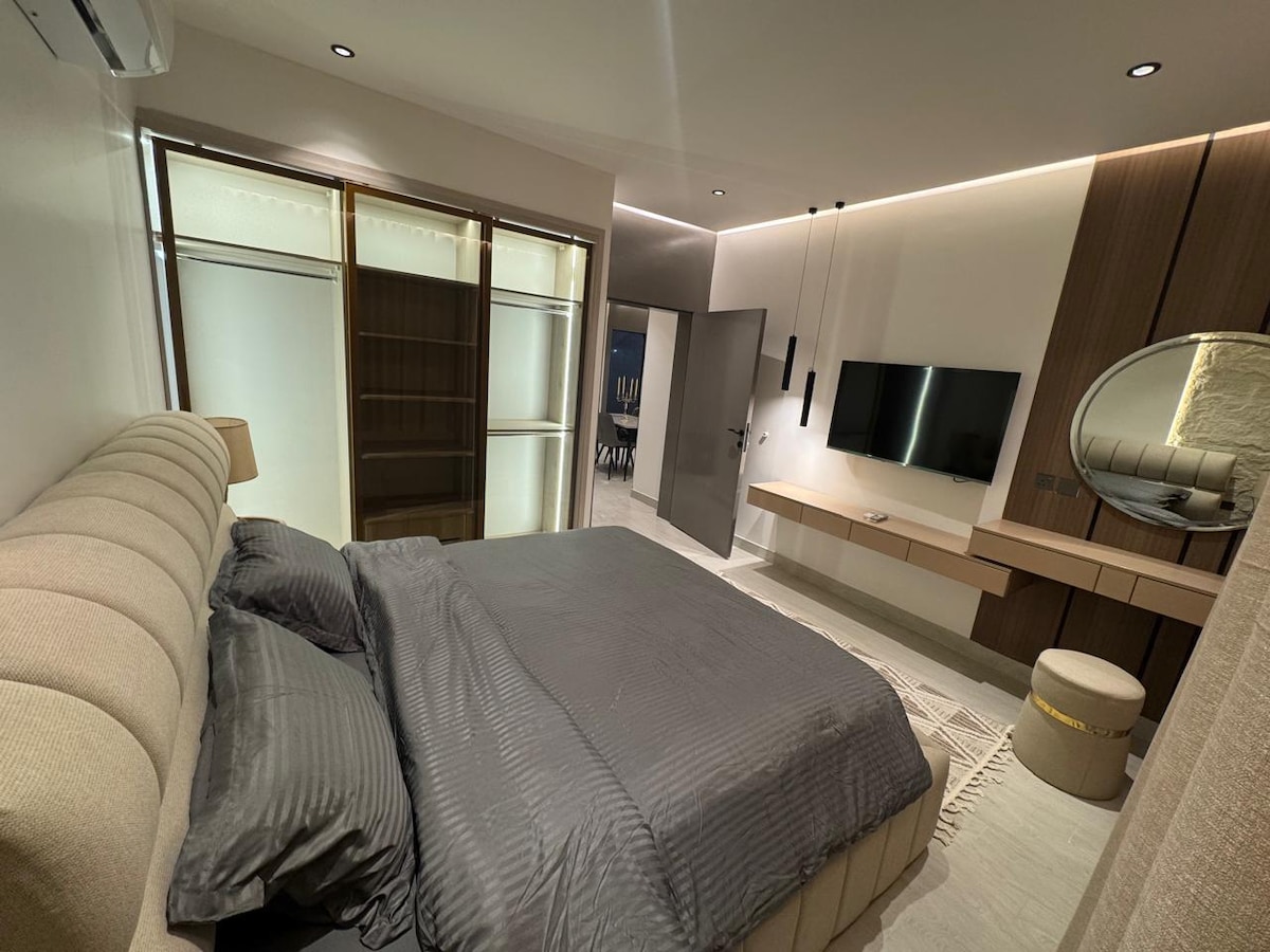 Serenity Housing – Tabuk Modern 2BR apartment with a living room and bathroom, fully equipped kitchen designed for your comfort. 3 mins to Park Mall Smart check-in, Wi-Fi, Smart TV, coffee and cooking equipments. Perfect for families and business travelers. Book now for a stylish stay.