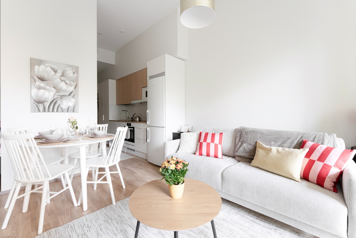This studio apartment (33 m2), suitable for one or two people, feels intimate and cosy. It has been designed with high quality materials and provides everything you need for a short or long stay. The studio is located in the popular Ranta-Tampella neighbourhood, just a few steps from Näsijärvi lake. Please note that the apartment does not include a parking space, but public parking is available nearby.