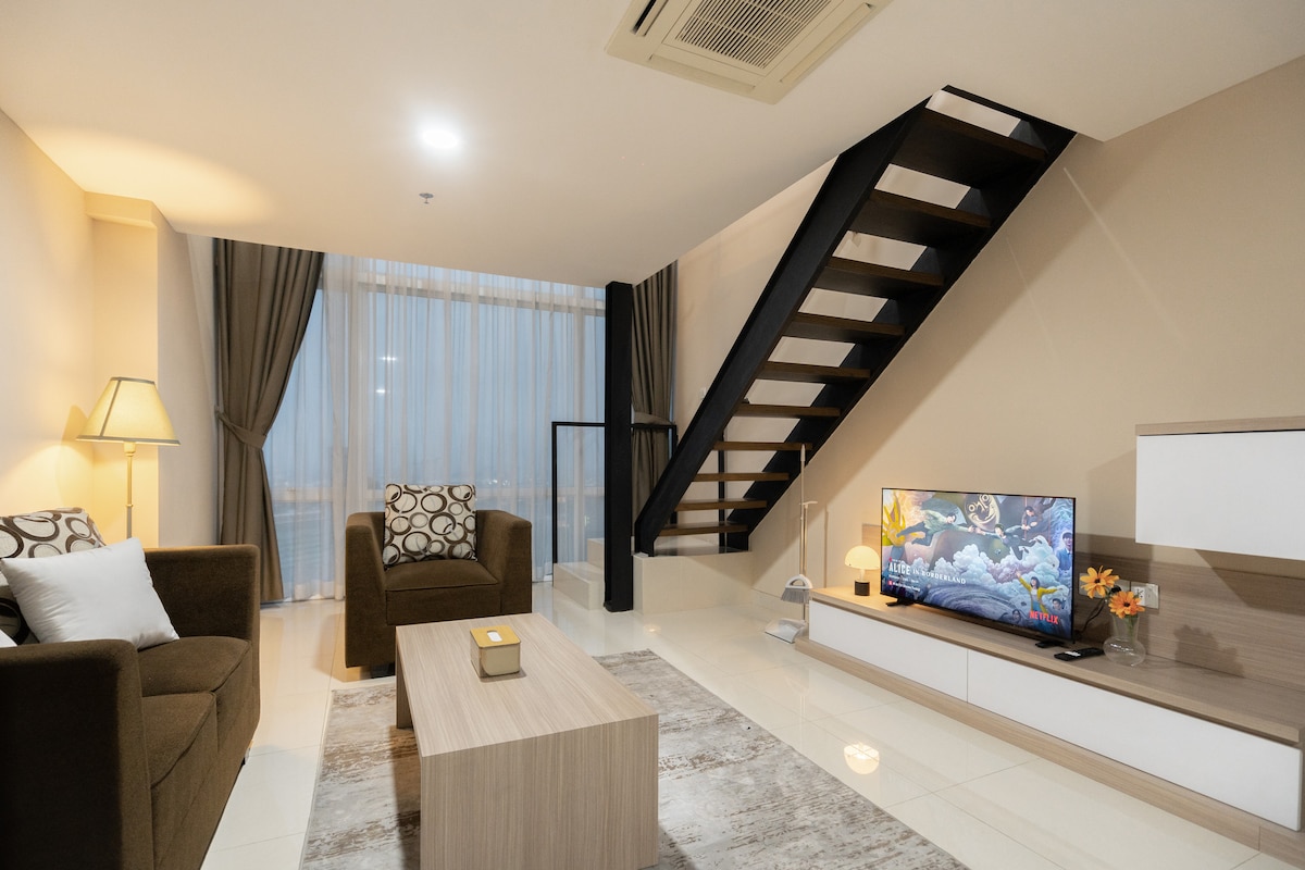 Professionally Managed by Kozystay Escape to a thoughtfully designed 2-bedroom retreat in Tangerang — blending Japanese-inspired calm with modern luxury, complemented by a private lift, loft-style layout, pool, gym, and a prime city location. AVAILABLE TO GUESTS: + Digital Check-in + Professionally Cleaned (disinfect) + Hotel Grade Amenities & Fresh Linens + Free High-Speed Wi-Fi & Cable TV + Free Access to Netflix