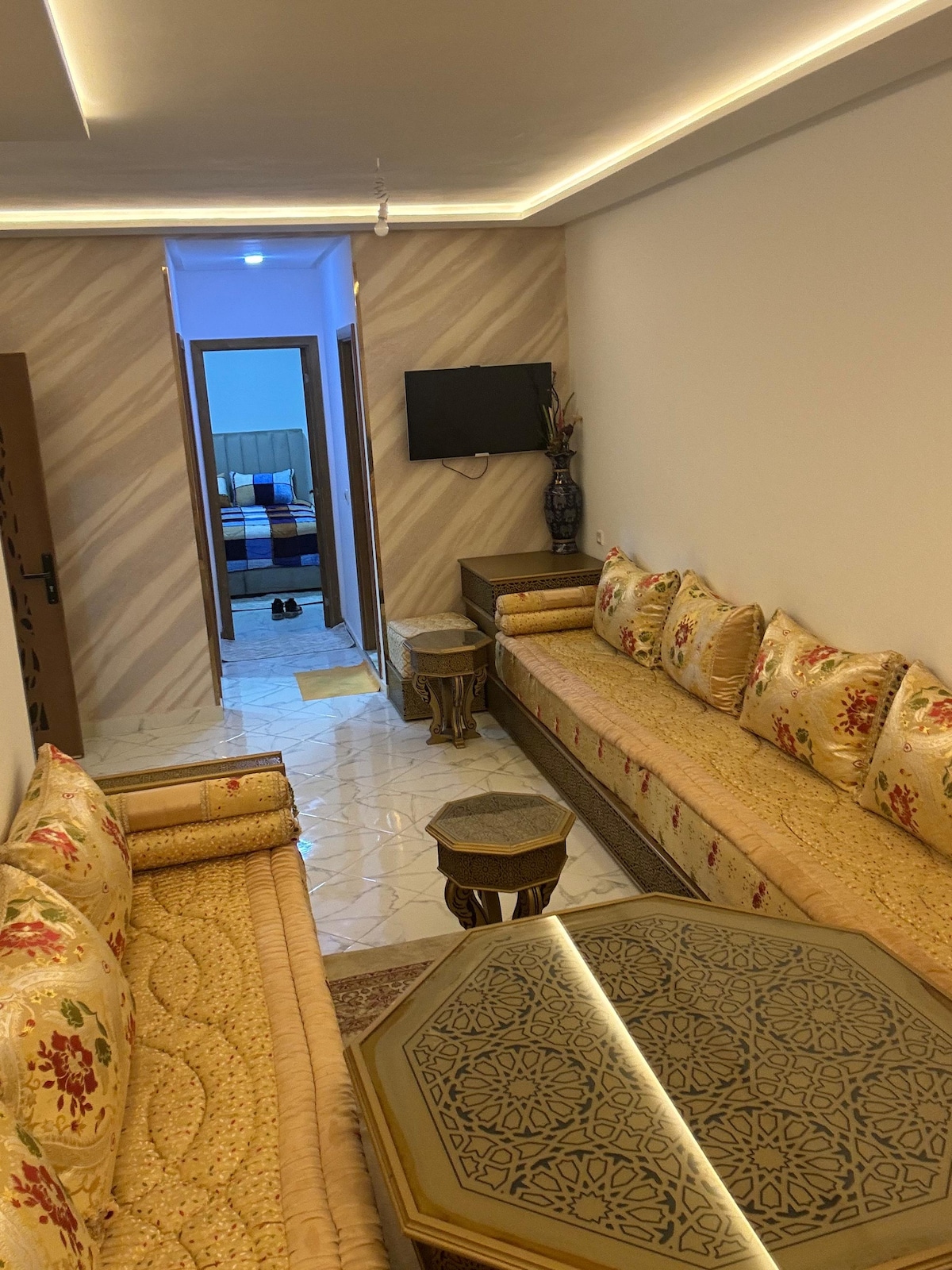 Bienvenue dans notre Moderne Appartement à 2 pas de la plage 🏖️, idéal pour familles ou amis. -Chambre parentale avec lit standard et vue mer 🛏️. -Deuxième chambre avec deux lits 90cm une personne, vue mer. -Salon moderne et lumineux 🛋️ avec vue mer. -Balcon ensoleillé 🌅 vue sur mer. -Cuisine américaine moderne et équipée 🍴. -Calme, raffiné et proche des commodités : cafés, restaurants et promenade. Parfait pour un séjour inoubliable à Tanger.