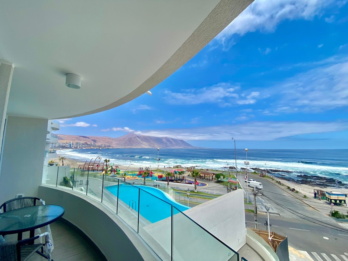 ⭐ Disfruta de una experiencia única y exclusiva en este amplio y lujoso departamento ubicado en el exclusivo condominio Mar Egeo. 🏠 Ubicado al frente de playa brava y a pasos de playa Cavancha, en una de las zonas mas exclusivas y turísticas de la ciudad de Iquique. Cercano a restaurantes, farmacias, caja de cambios, casinos y pubs. ☀️🏊♀️ Relájate y disfruta de sus maravillosas vistas a la gran piscina del condominio y a playa brava. Ademas de los exclusivos muebles de terraza.