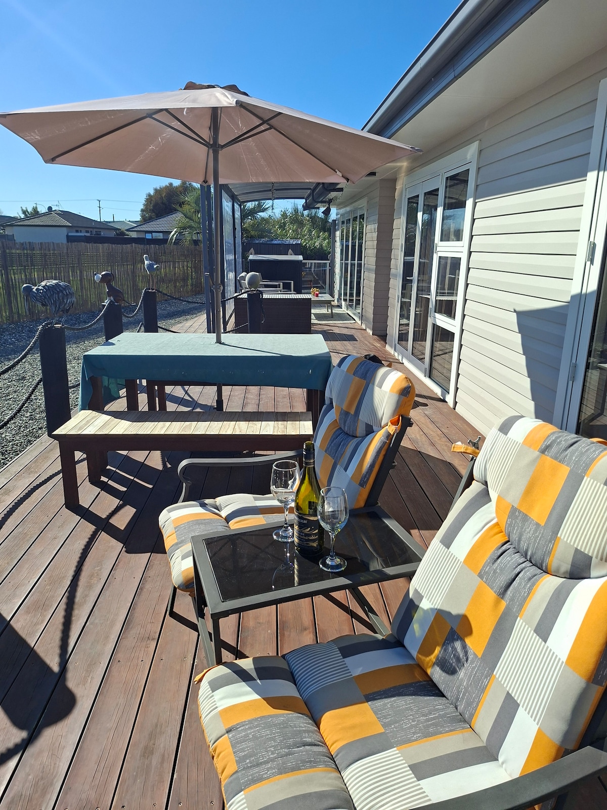Nestled in a tranquil garden this self-contained architecturally designed studio, is surrounded by glass, with multiple outdoor living spaces. With a private outdoor bath and open fire, this is the perfect romantic getaway. Situated by the ‘Great Taste Bike Trail’, we provide two bikes & helmets included in your rate, as well as some local treats on arrival. A vineyard at front and market garden at back, you are in the country, yet only five mins by car to Richmond, 20 mins to Nelson City.