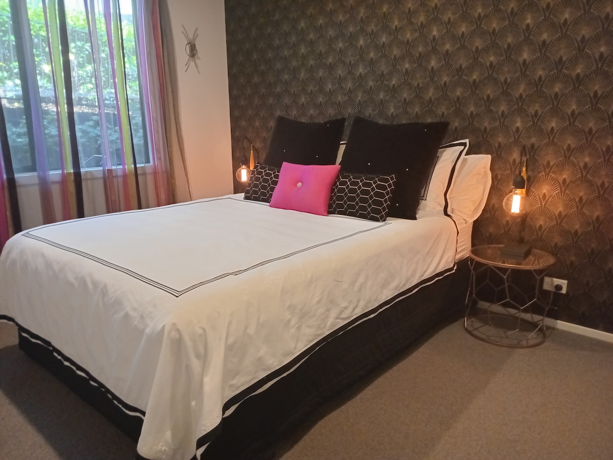 Enjoy the glamour of this stylish, upscale studio. Your own self contained space, comfortable and quiet, close to the airport and 7.3 km from the town centre. Lake access close by and a supermarket, restaurant, stores and cafes within walking distance. Only 3 minutes from "The Drop Zone" with 10 pin bowling, gaming, mini golf, cafe, and laundromat. Easy access to and from SH1 south and north. Secure undercover parking for motorcycles and off-street for cars.
