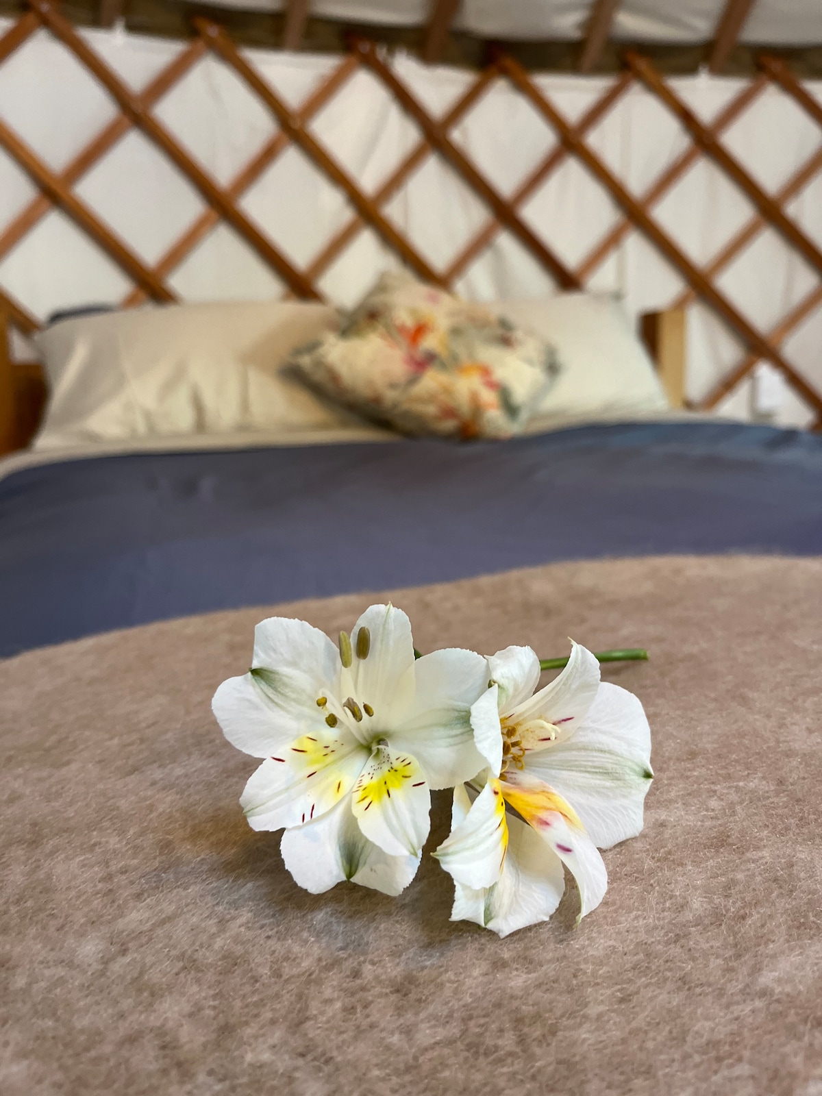 Ultimate glamping experience. Silk lined walls kingsize bed warm and cosy …with new heat pump heats the yurt in minutes even in the heart of winter . Modern kitchen plumbed toilet and delux hot shower in adjoining building- this is accessed via the yurt onto covered deck about 1 meter in distance.Set in a secluded tranquil private garden on a landscaped 2acre property.Wake to amazing mountain views and birdsong