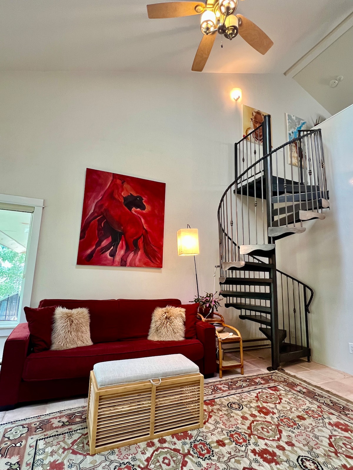 Walk Everywhere! Free Parking! Our comfortably furnished studio with loft, conveniently situated in Telluride, offers you mountain views, convenience to festival venues, trailheads, stores, restaurants and a shared hot tub to relax after a fun day in the outdoors. Walk to all events!! Full kitchen, Dining nook with sunny mountain views, Smart TV, fast WiFi, AppleTV, Roku. Your choice of sleeping in the glass-enclosed loft queen bed or the queen-sized American Leather sofa bed. Free parking