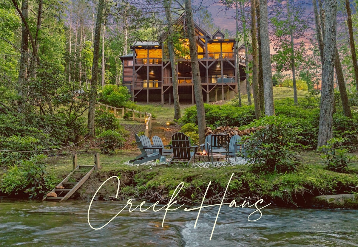 The Creek Haüs is a stunning 6-bedroom retreat featuring 3-king suites, 1-queen suite, cozy bunk-room and a private king suite above the garage, known as the loft. Enjoy two living rooms, a movie lounge, and game room with a pool table, ping-pong, shuffle board and more. Outdoors, relax in the hot tub, grill a feast, gather around the fire pit and enjoy direct creek access with tubes for floating. With two kitchens and ample space for entertaining, this Blue Ridge, GA gem is perfect for making m