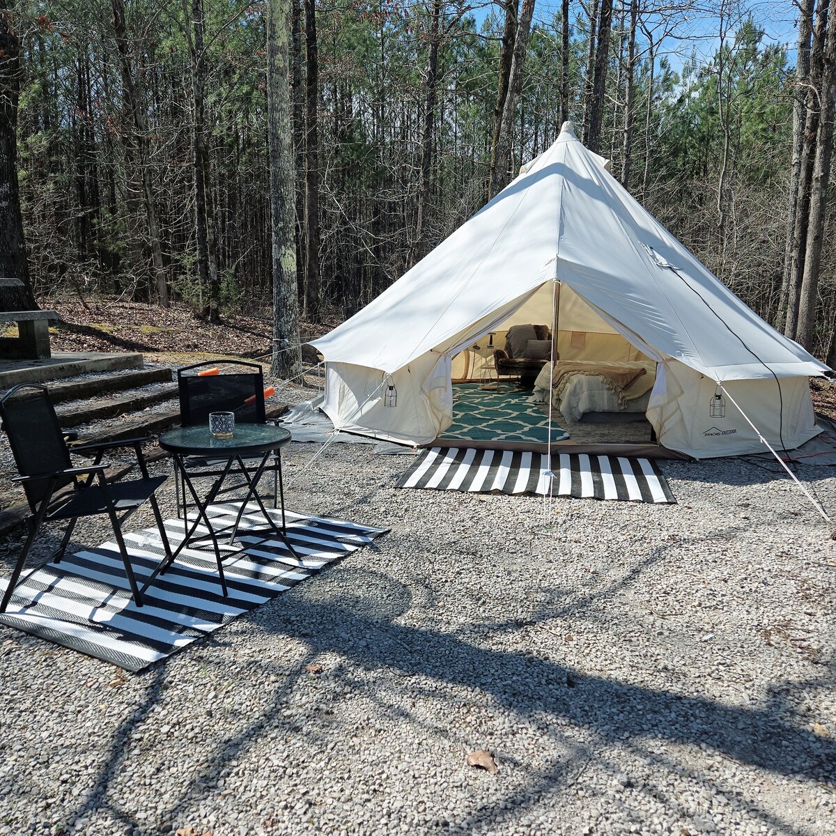 Our Tent, Hazel, is 20ft, on a deck platform and nestled in the woods on our small, private campground and homestead. Complete with a queen sized bed and futon that doubles as a twin sleeping option; this tent can house up to a party of 5 spaciously. Non-electric, but provides you with the comforts and essentials to camping in all seasons! Close to the shower house and restrooms. Provides a chance to unplug and relax just 25min outside of Nashville. Luxury camping at its best!