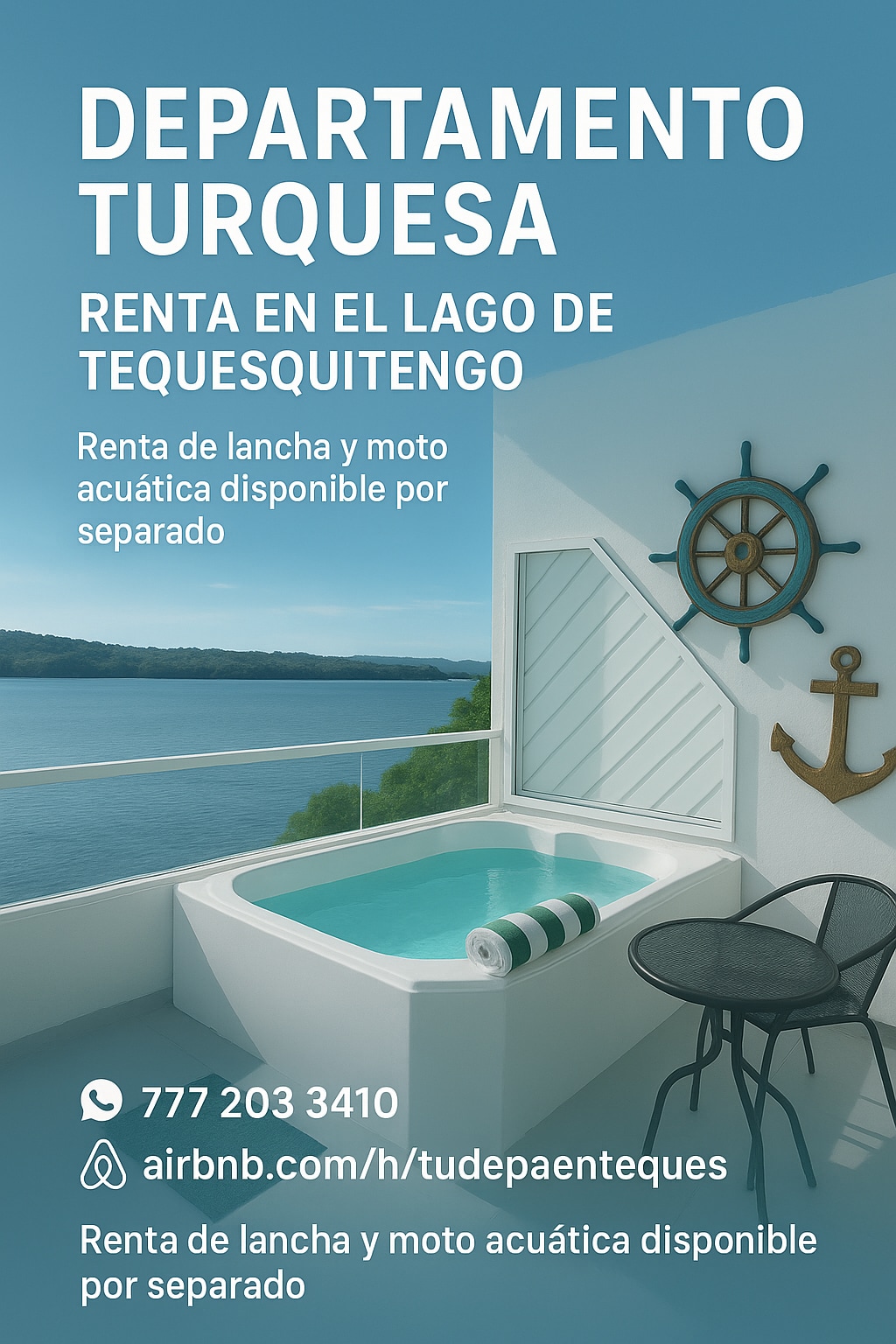 "Teques: Ground floor apartment, private garden, 2 bedrooms with triple bunk beds and shared bathroom, 1 master bedroom with bathroom, double bed, and private garden jacuzzi. Equipped kitchen, private charcoal grill (cleaning fee $250.00), steps away from the pool, palapa with sunbathing area, common jacuzzi, and playground. Private dock with additional services such as kayak, boat rides, water skiing, tubing, parachuting, and plane rides over the lake. Heated pool from Friday to Sunday."