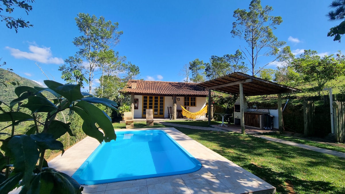 Instagram: sitioo_paraiso Casa confortável, de bela arquitetura e um visual encantador, perfeita para descansar com amigos e família e além de tudo com um fácil acesso a Teresópolis. A casa de aproximadamente 200m², possui 4 quartos sendo 3 quartos com camas de casal + 1 quarto com 2 camas de solteiro. Possui também uma piscina, sinuca, churrasqueira e diversas árvores frutíferas, fique a vontade para usufruí-las. Perfeito pra você que quer lazer e descanso.