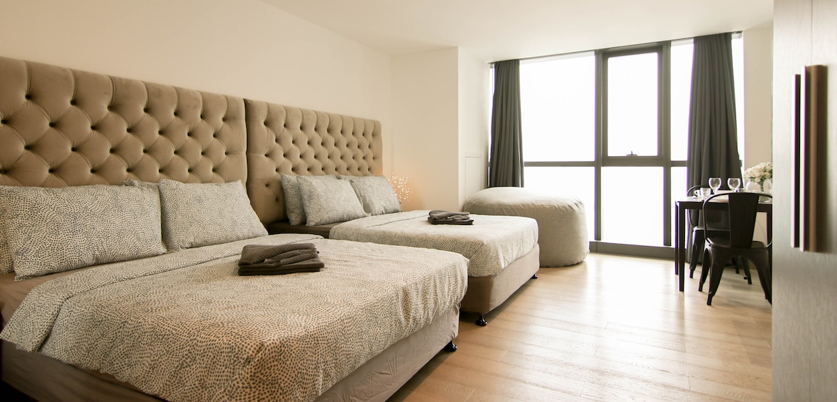 宽敞的世纪塔楼,2张标准双人床,55英寸电视,可收看Netflix
