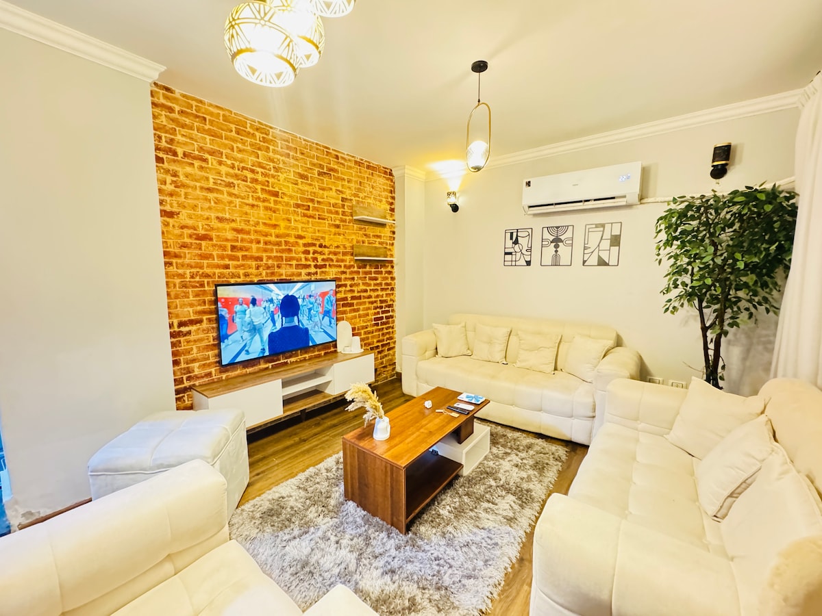 Luxurious 3 bedroom, 2 bathroom apartment - just a 10 minute walk from Giza Pyramids and Grand Egyptian Museum. The spacious open-plan living and dining area provides an inviting space to relax after a day of sightseeing. Prepare meals in the fully equipped kitchen - Daily housekeeping - WiFi - Free parking -Netflix -Nespresso machine -Butler service - Concierge and booking service Newly furnished and limited time offer!!