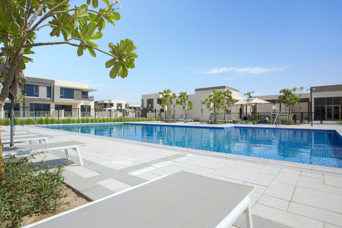 🌴 Relax in style at our elegant villa with a pool view from the balcony 🏊♂️. Blending modern sophistication with cozy charm, this spacious home offers 🛋️ contemporary furnishings, a fully equipped kitchen 🍽️, and serene bedrooms 🛏️. Enjoy access to a pool, gym 🏋️, and sports courts 🎾. Perfect for families or groups exploring Dubai’s top attractions 🏙️—all just a short drive away 🚗. Your peaceful luxury getaway awaits ✨.
