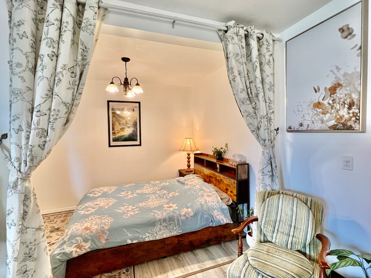 Welcome ! Beautiful, newly furnished in our lower level. There is a private bedroom ,complete with Memory Foam Pillows ! A twin bed in main space ! All beds have 100% cotton sheets! Equipped with a keurig, kettle, microwave, toaster & bar fridge. Coffee and tea , coffee mate and sugar, glasses, coffee mugs and plates , bowls, cutlery and napkins. Free street parking! Cable TV .... 9 mins from the airport! Photo ID may be requested on checkin... 5% Municipal Accommodation Tax is included !