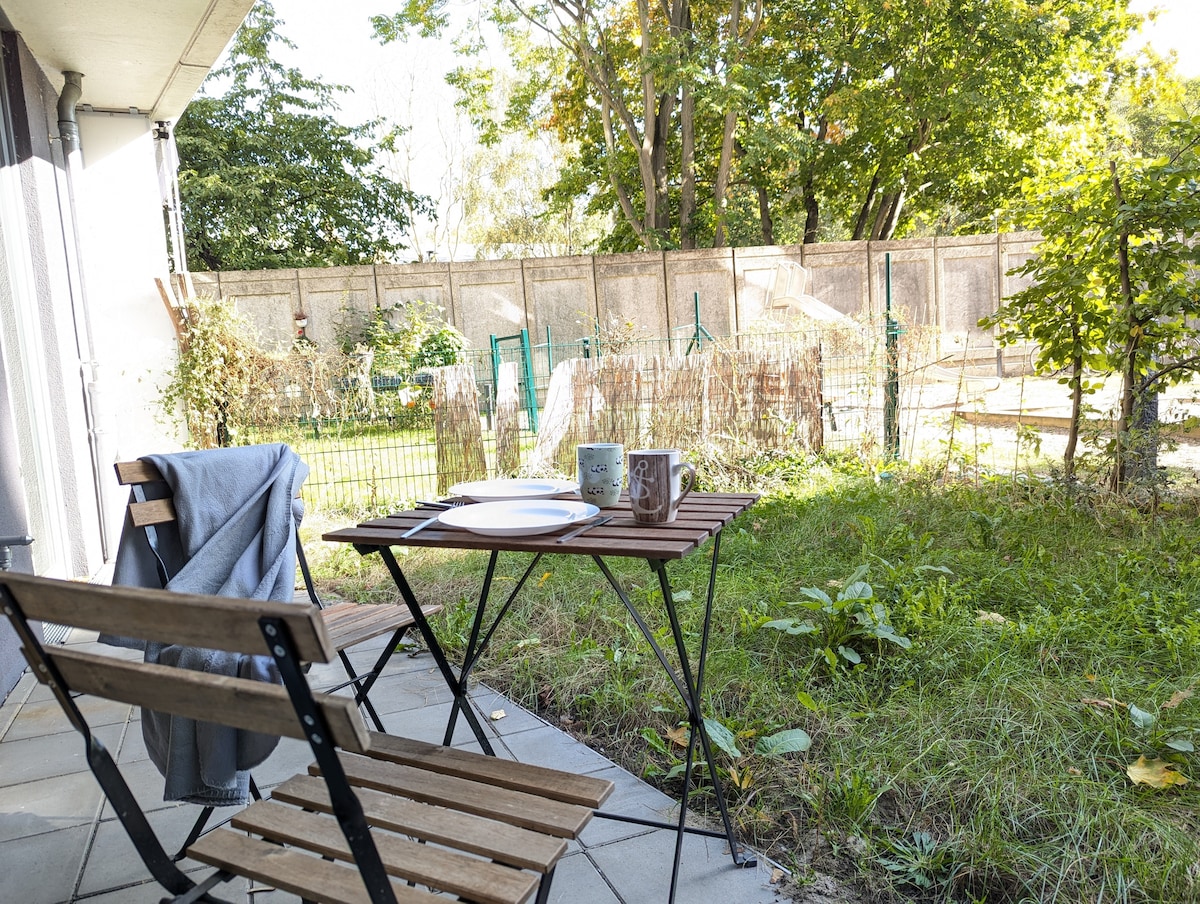 Warm & quiet 40sqm apartment with private entrance in a Bauhaus-style townhouse. 🌡️ Underfloor heating fills the space with gentle warmth. Soft daylight from the 4m sliding window sets a calm mood. Step outside to the cozy Terrace for your first morning coffee, feeling the crisp air and peaceful garden around you. Perfect for slow mornings & cozy evenings. ⚡ Very fast WiFi · 👥 2 guests · 🍳 fully equipt Kitchen · 🧺 Washing Machine