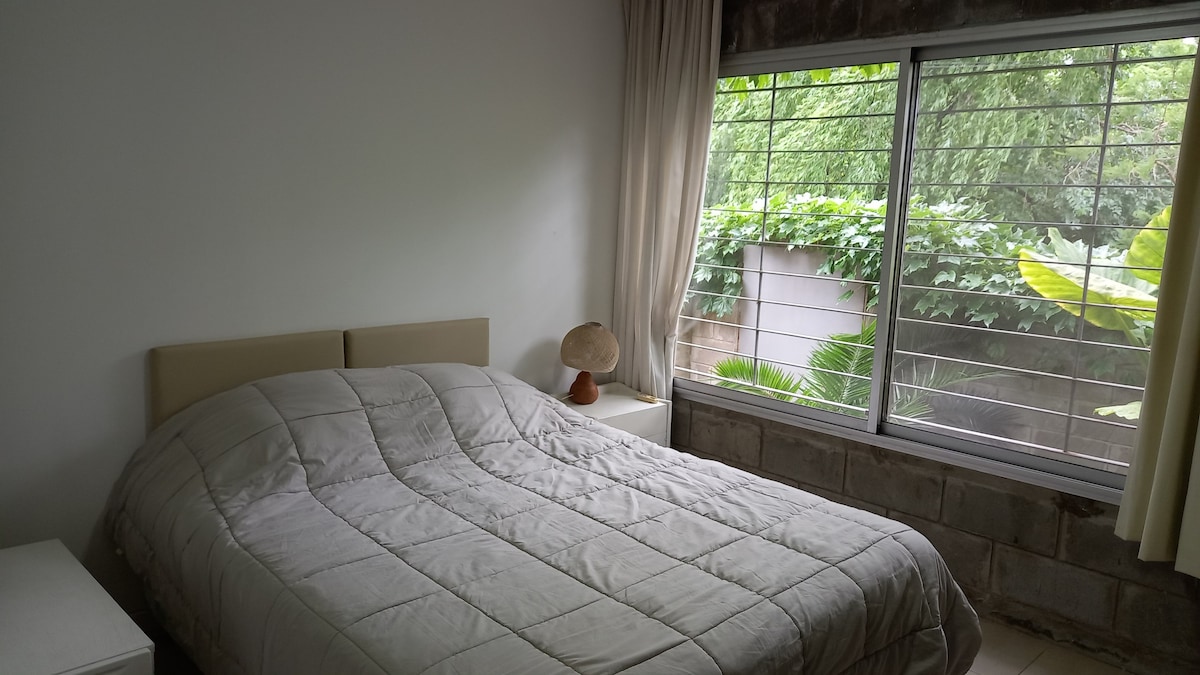Situado en Tigre Ciudad (zona residencial, no Delta). Un ambiente calmo y cálido, con mucho verde. Si bien se encuentra en Tigre continental su estructura y vegetación te hacen sentir que estas en las islas del Delta. Las habitaciones están conectadas, para acceder al 2do dormitorio es necesario pasar por el 1er dormitorio. El alojamiento se encuentra dentro del mismo predio en el que está nuestra casa. Son dos edificaciones diferentes que comparten jardín, solárium (deck) y estacionamiento.