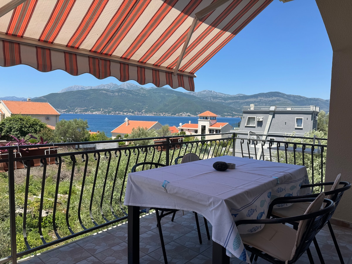 Very bright 1 bed/1 bath apt., sofa can be used only for a child of 4-10y old, southeast-facing big terrace, expansive views of Lovcen National Park & Tivat Bay. Peaceful downtown location. A/C, equipped small kitchen, 3min walk to sea & beach. 5min walk to Porto Montenegro. 2min walk to green market, promenades, stores, restaurants & cafes. WIFI and Cable TV free of charge. Please be aware that you can not book a day before other guests stay or one day after their stay as we need to clean up