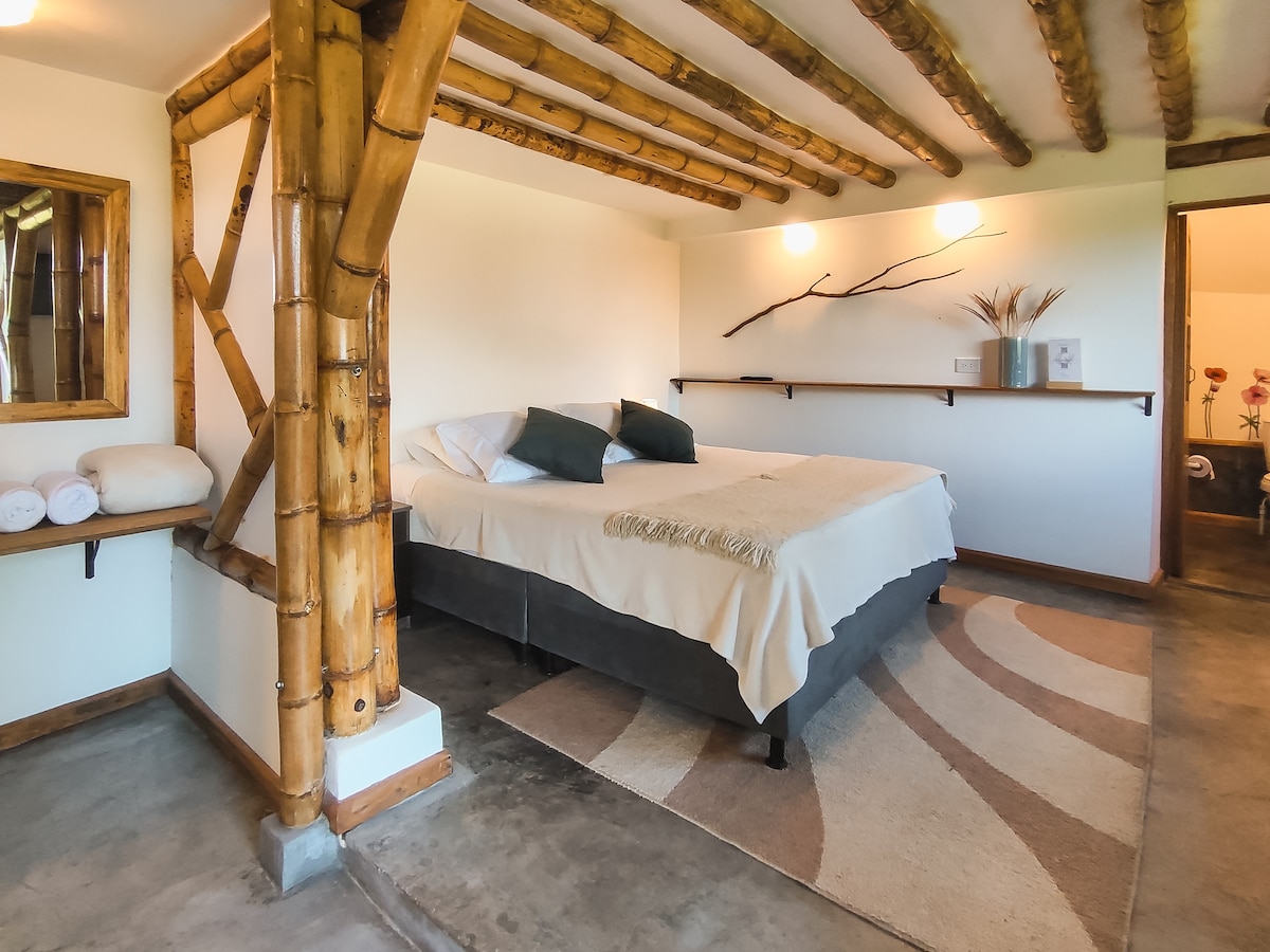 Habitación amplia y luminosa, ubicada en el segundo piso de nuestra finca cafetera. Cuenta con cama queen, baño privado con agua caliente, TV, minibar y detalles de confort que harán tu estancia inolvidable. Disfruta del tour del café: recorre los cafetales, cada etapa del grano y degusta café fresco mientras te relajas en la naturaleza. Podrás explorar nuestros jardines, cultivos y el sendero ecológico, todo acompañado de un servicio cálido y personalizado que te hará sentir como en casa.