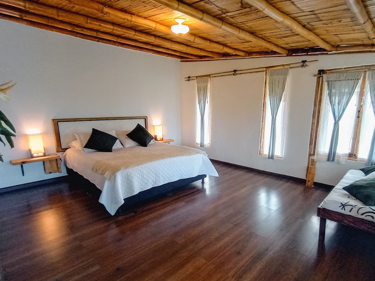 A lovely small detached house/apartment that is next to our main house yet independent enough for privacy. Beautiful views on a small farm with an enchanting path through our bamboo forest. Has kitchenette and sleeps up to 6. We are about 25 minutes from Armenia, Colombia by car. Please know that the price listed is for the first guest, and additional guests will by charged $20 additional per night. Breakfast is included.