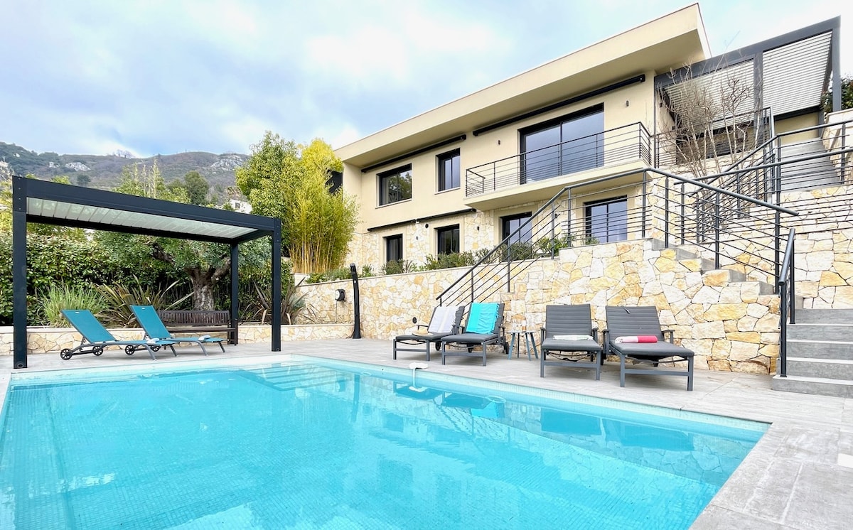 Deze moderne en volledig airconditioned nieuwe villa is gelegen op loopafstand van het middeleeuwse dorp Tourrettes-sur Loup en heeft adembenemend uitzicht op de bergen en de Cote d'Azur. Met haar 4 slaapkamers, grote open keuken met aangrenzend buitenterras, ruim zwembad en riante tuin met jeu de boulesbaan is het heerlijk ontspannen in deze villa. Een fitnessruimte en speelkamer met pingpong tafel zorgen voor sport en spel tijdens de vakantie!