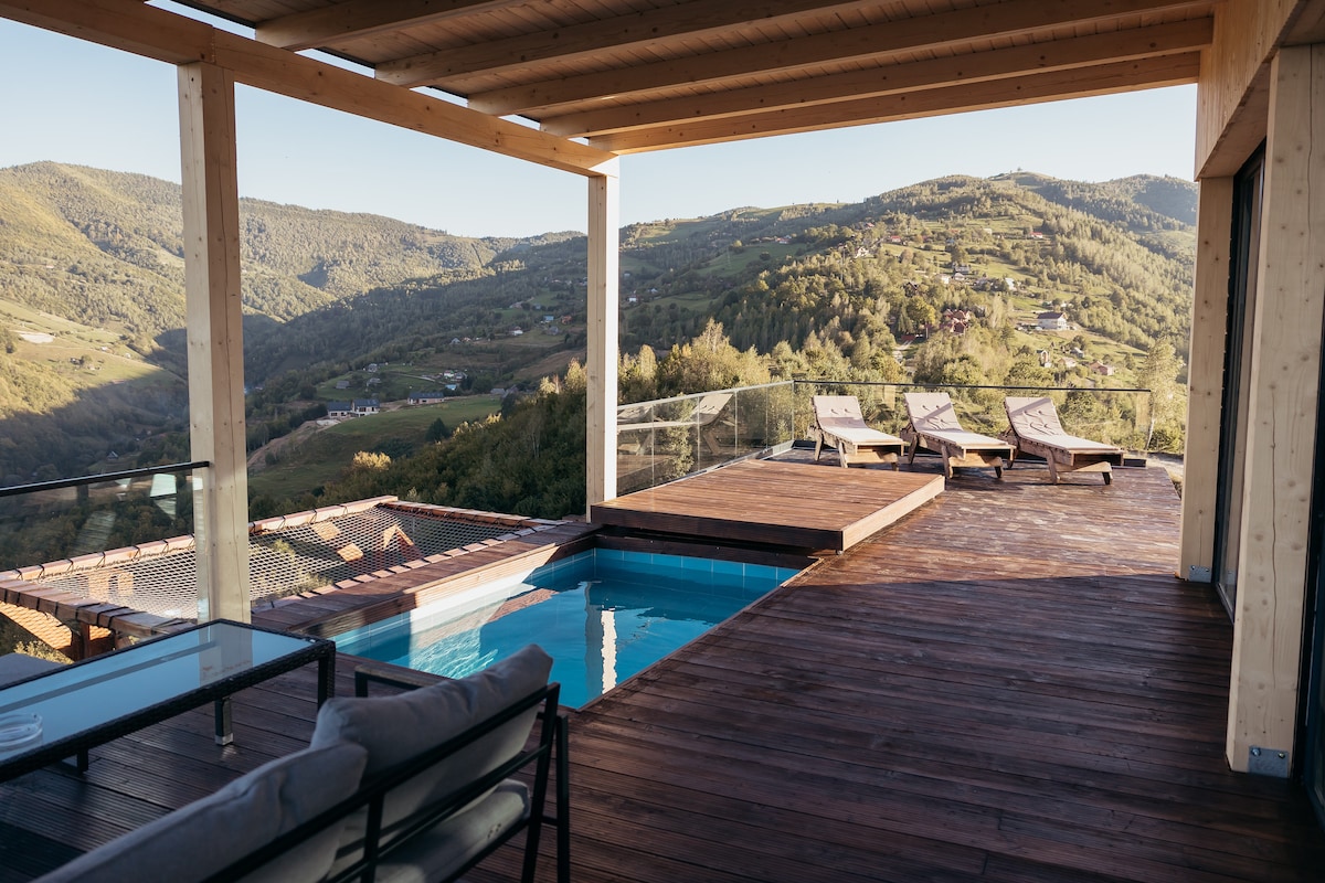 A peaceful oasis with a private hot tub under the open sky and a pool surrounded by nature. Set on a hilltop, with views of the Carpathians and Mt. Ciucaș, the guesthouse is built in traditional style using timber and shingles. Ideal for couples, families or friends seeking quiet, beauty and an authentic Transylvanian experience.