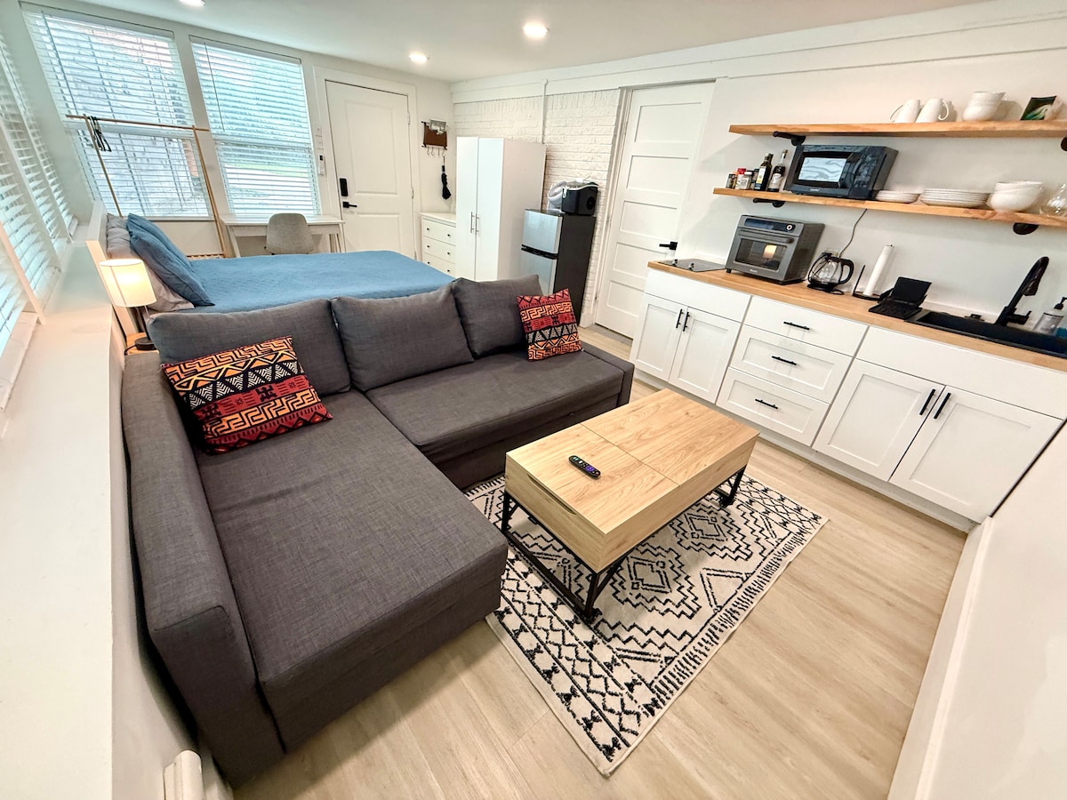The SoCo Cottage Collection 5 is in a quiet, residential neighborhood, one block off South Congress. It is set up as a studio, with a comfortable queen bed, small kitchenette, Amazon Fire TV w/ Amazon Prime, High-Speed Wifi, full bathroom, & electronic keypad entry. This cottage has one shared wall with the main house, but is a separate dwelling with its own entrance & no shared facilities. This space can also be booked with sister cottages on the property if needed. Luggage storage available.