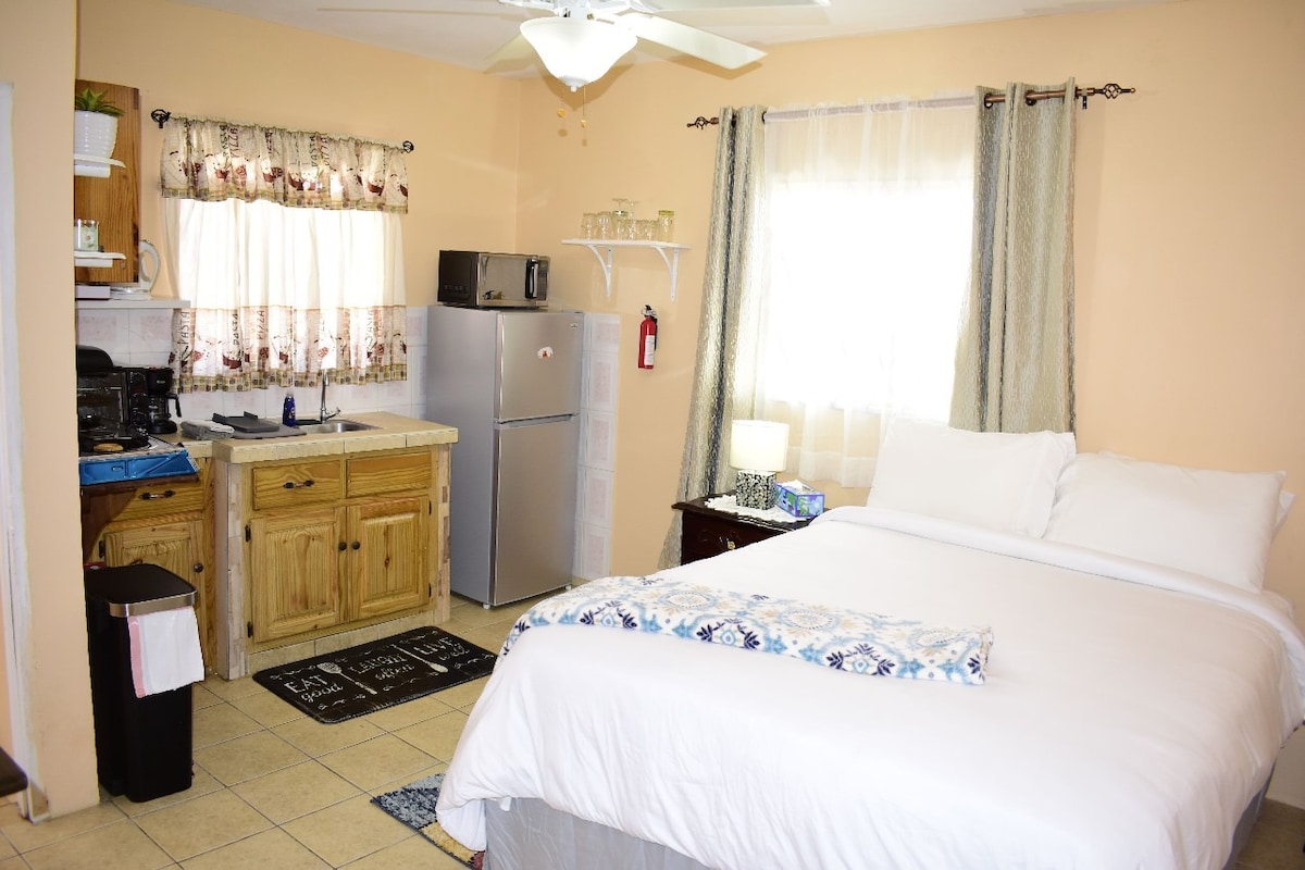 Beautiful, colorful and very cozy Studio room in the middle of Pon di Rock Gardens with a spacious balcony overlooking the ocean and a well equipped kitchen. The room is situated higher up on the property with gorgeous views of Fort Charles beach. The Likkle Beach is a 5 min walk. Treasure beach center and Black River are a few minutes drive where you will find restaurants and entertainment. Sunsets and Moonsets are the best from this room. Its a magical place..got to be there to feel the magic