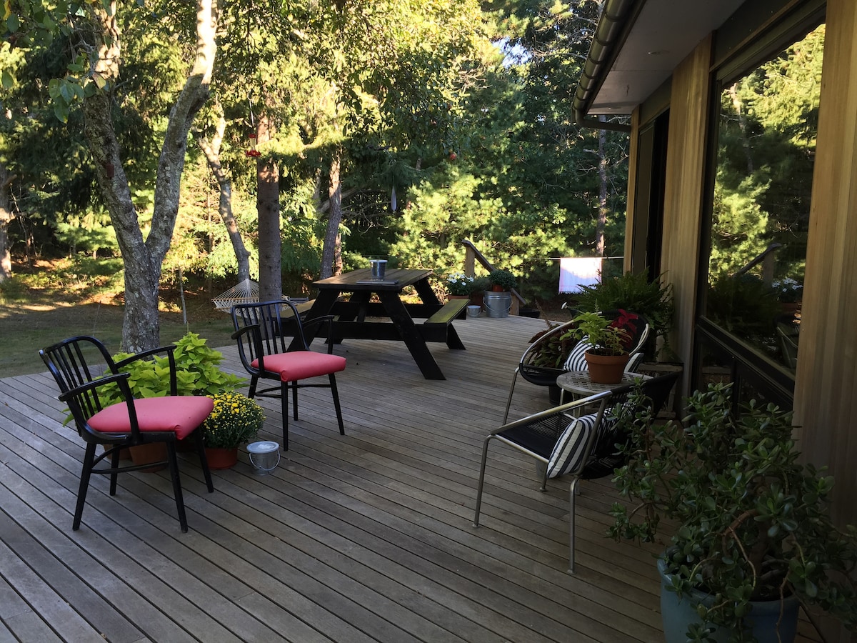 Don't miss this beautiful, pet-friendly, comfy 3 bedroom home that is totally private, filled with beautiful local artwork, and only minutes from the beach. Outdoor shower, 2 fireplaces, vaulted ceilings with skylights, wifi, cable, ping pong, air hockey, 2 full baths, hammocks, built in Bluetooth speaker system and air conditioning! A true chance to get away and live the Cape life!