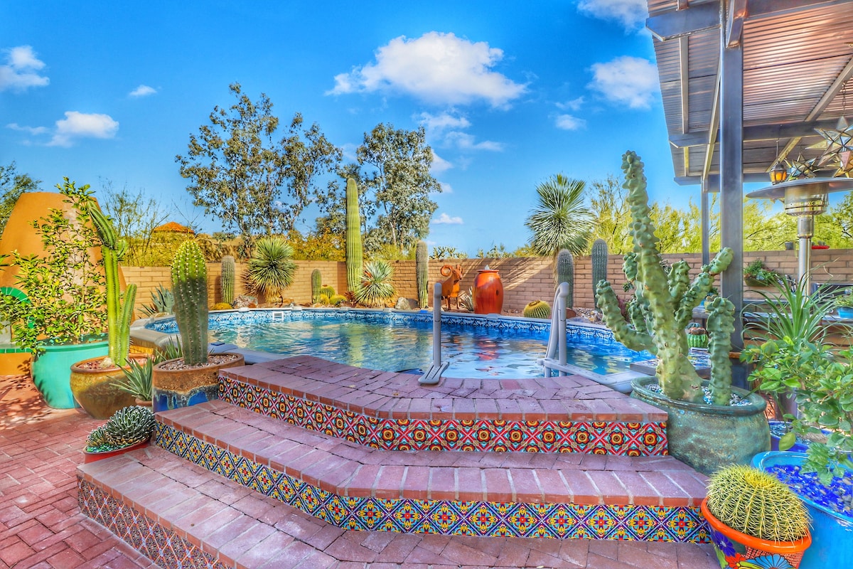 The home is a classic adobe style 3 Bedroom 2.5 Bathroom with beautiful exposed wooden log ceilings in the living room, custom saguaro rib shutters & traditional saltillo tile floors. Enjoy all the comforts of home in this 1,800 square foot house with a beautiful secluded private back yard with a private pool & hot tub. Enjoy the peace & birdsong. The house is fully equipped with everything you will need for your stay, close to restaurants, shops, Golf & all the outdoor adventure you can imagine