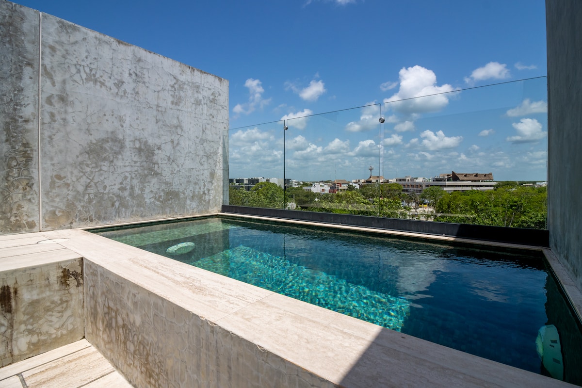 Discover paradise in our 1-bdr retreat in Tulum, just 300 meters from the main avenue and the hotel zone/beach of Tulum. Immerse yourself in luxury with a bdr featuring a king-sized bed and a full bathroom, as well as a sofa bed in the living room. Step out onto your private terrace with a jacuzzi, hammock, and lounge area. Go to the rooftop pool. Marvel at the exclusive glass bridge over the pool. The location is key: just 5 minutes from beach clubs, with access included for our guests.