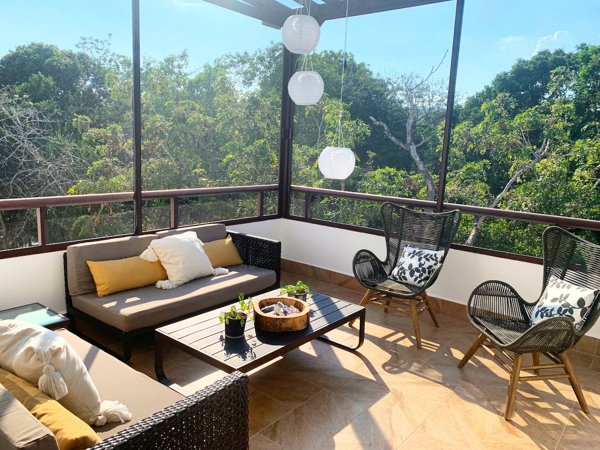 - Nature-inspired condo in a tranquil jungle development with a mystical vibe! - Enchanting surroundings with lounge spaces, pools & two unique cenotes - Amenities: co-working, gym, yoga loft onsite & just 8-min drive to town - Private balcony, lush views & private rooftop with dining, plunge pool & grill - FiberOptic Wi-Fi, laptop workspace, washer, dryer, and free parking