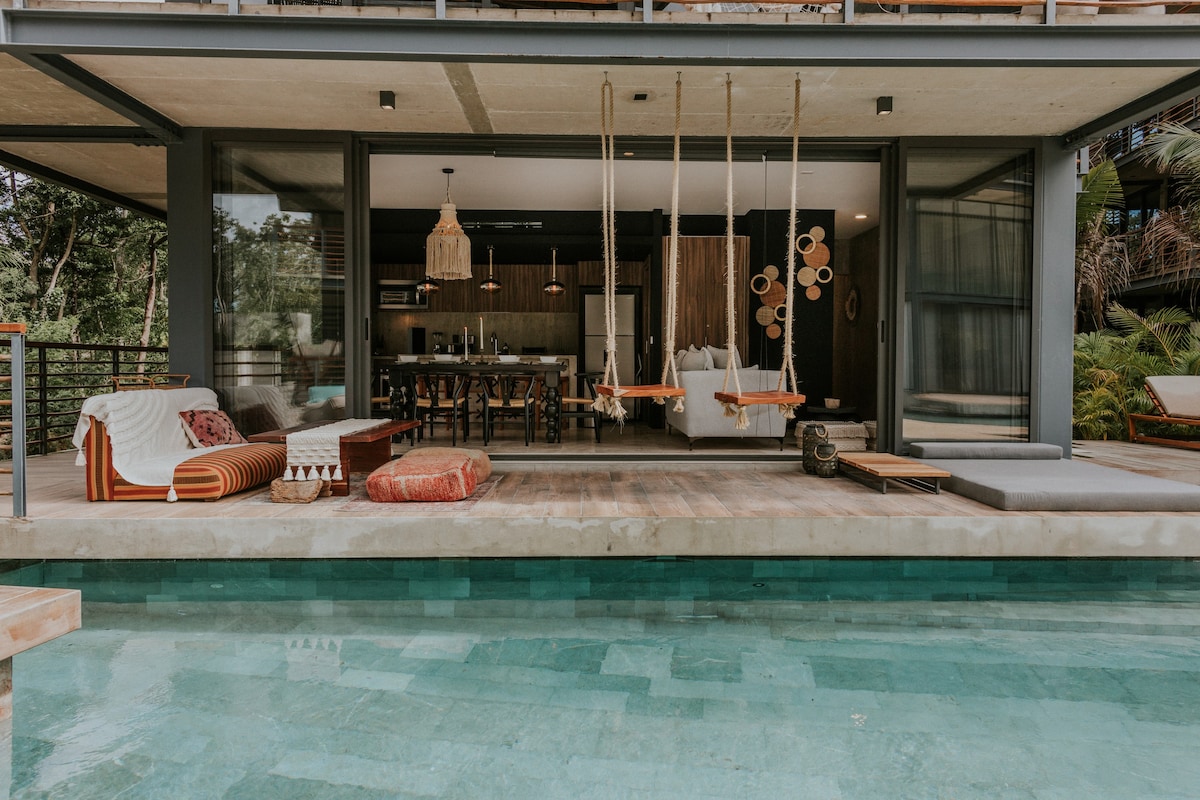 Your Tulum dream awaits in this stunning 2-bedroom jungle sanctuary. Wake to panoramic Mayan Ruins views through floor-to-ceiling windows, unwind in the treetop hammock, or swim laps in the crystal-clear pool. Boutique design meets authentic comfort, king beds so dreamy guests rave about them and rooftop yoga overlooking the Ruins. 5-min walk to town's best tacos, quick bike to pristine beaches. 24-hour security, responsive hosts, and that "hard to leave" magic guests can't stop talking about. ✨