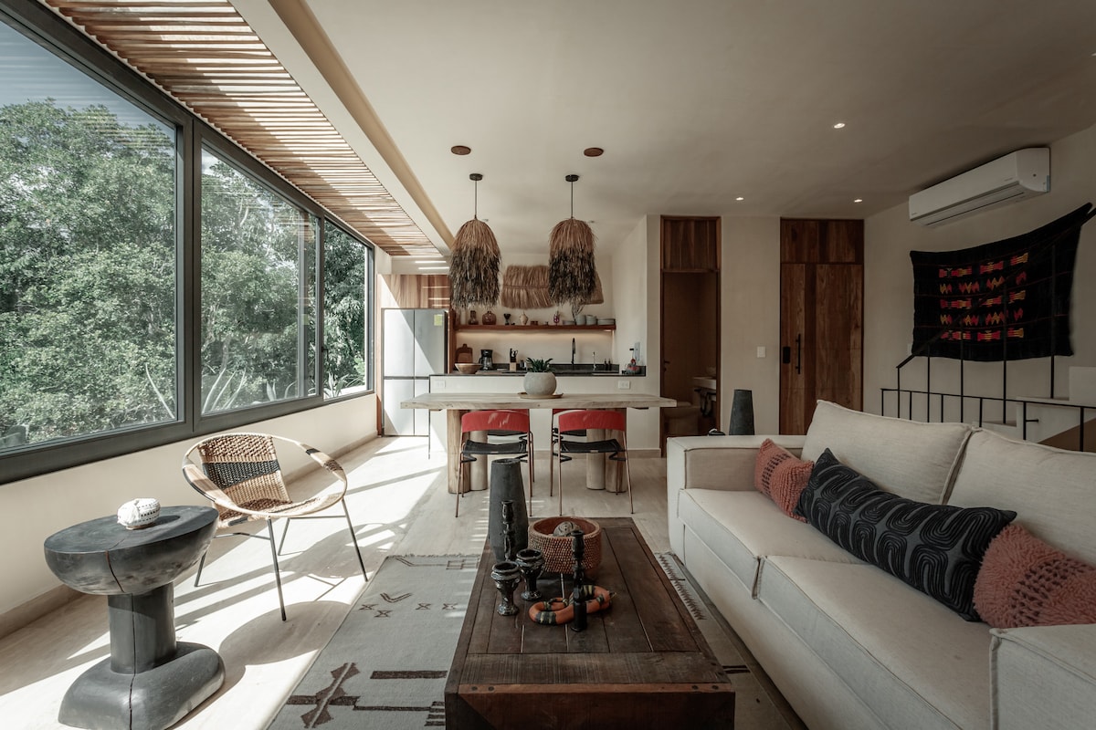 This is a one of the kind loft: Awaking in soft sunlight between palms and trees and feeling the breeze from the ocean. Located in a quiet, safe and famous area of Tulum called "la Veleta" you get the best of magical Tulum: nature, luxury comfort and a world class design. Super Fast Fiber Internet unique interior Design private rooftop pool free filtered water great equipped kitchen ambient light 2 large king size beds private chef (add cost) private massages (add. cost) tours, shuttle