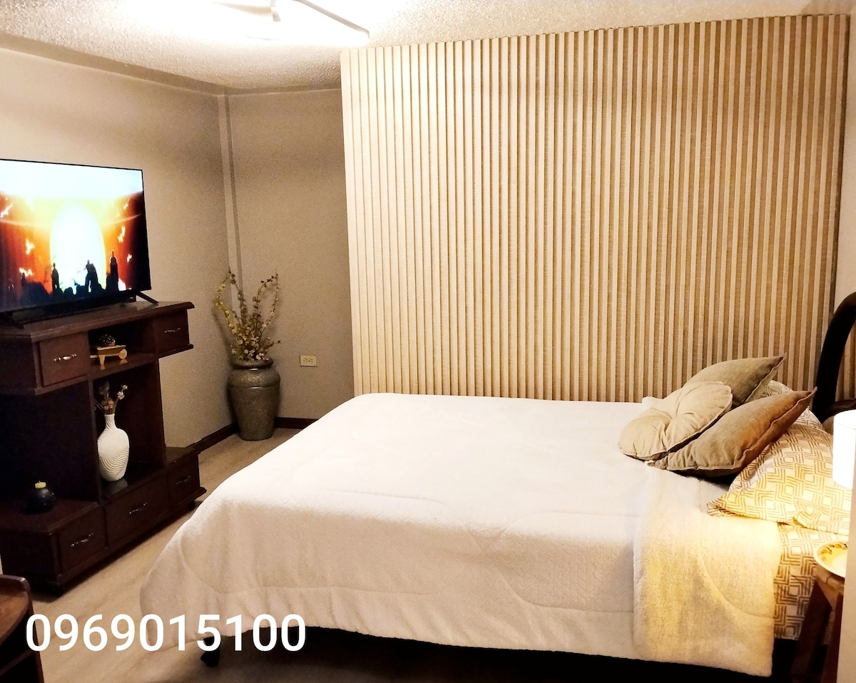 Located in the heart of Baños, our exclusive Japandi-style luxury suite offers the ultimate comfort. Relax in the jacuzzi with a 32" TV or enjoy a unique experience in the king-size bed with a 60" TV. An elegant and cozy space, perfect for romantic getaways, just minutes from the city's main attractions and restaurants. Experience luxury and tranquility in the best destination!