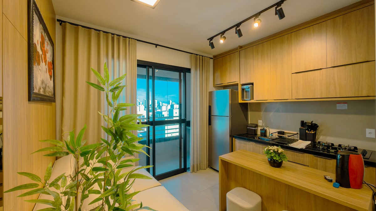 Hospede-se em um apartamento premium que une conforto, sofisticação e praticidade. Aproveite a piscina com vista na cobertura, academia completa, coworking moderno e bilhar. O apartamento conta com uma sacada agradável com vista da cidade ar-condicionado, Wi-Fi rápido e lavanderia com lava e seca. Ideal para quem viaja a trabalho ou lazer e não abre mão de alto padrão, comodidade e uma experiência superior desde o check-in.