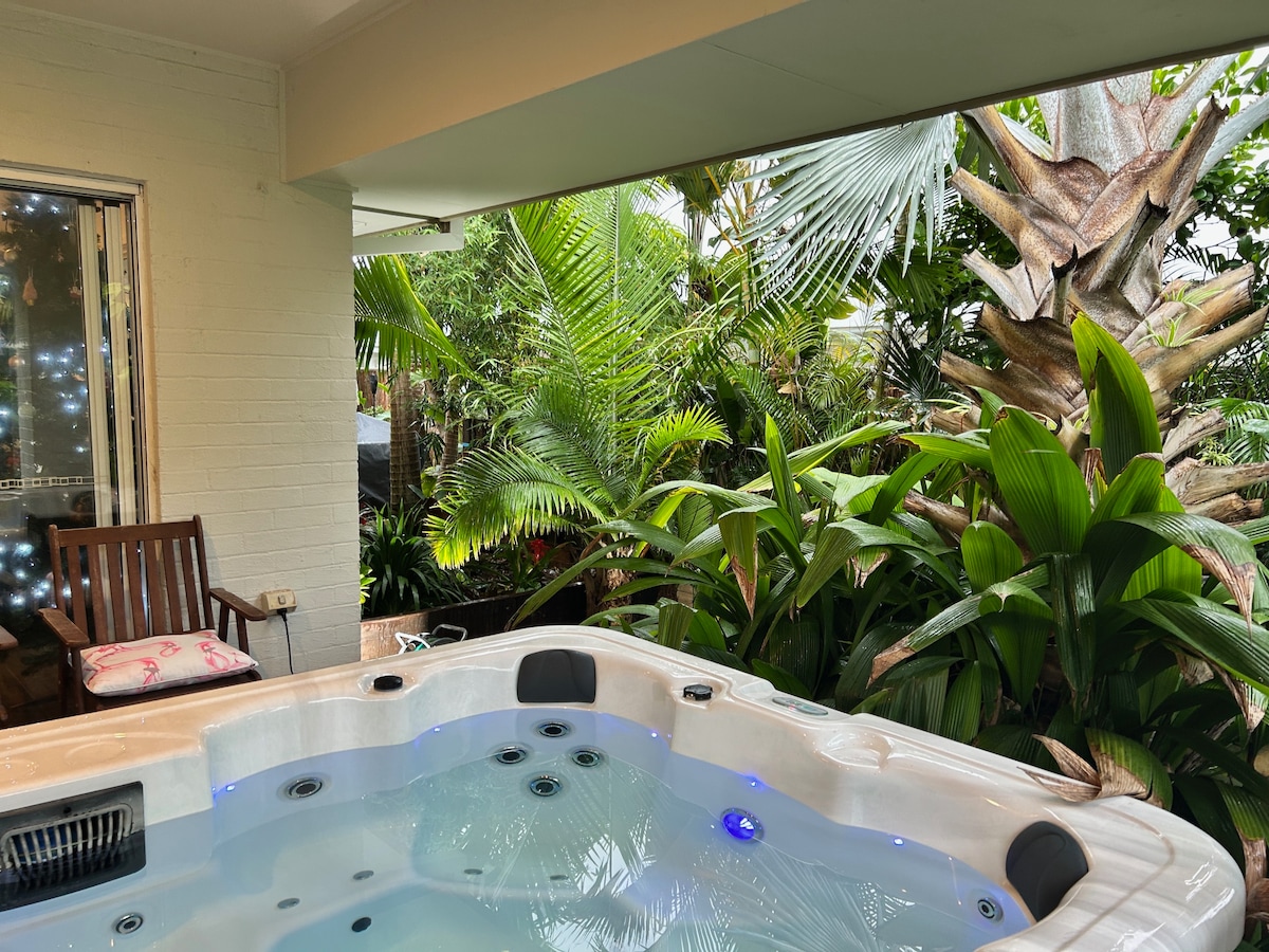 Beautiful spacious ultra modern cottage set in 5 acres of exotic sub tropical botanical gardens with natural pockets of rainforest and creek, where you can forget yourself and simply be. A stunning, fully fenced private space for up to 4 people to relax and enjoy the peacefulness of the surrounding Balinese water Garden and your own private plunge pool and 5 person hot tub in a beautiful gazebo. Totally peaceful space, but only 15 minutes to Mullumbimby, Brunswick Heads and ocean beaches