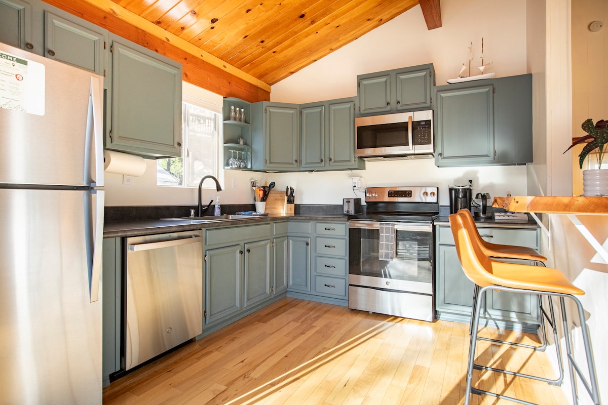 “The Avian” is a 2 bedroom A-frame with king size bed in the loft with a 1/2 bath. The 1st level bedroom has a queen & twin loft bed. Both bedrooms are equipped with AC, blackout curtains, comfortable bedding, additional blankets/pillows and fans. The living room has a wood burning fire place, 4K TV, Record & Bluetooth player, Apple TV, Acoustic Guitar, Blankets and Board Games. Other Amenities include Central Heat, W/D, parking, Hot Tub, outdoor gas fire pits, gas grill and outdoor seating