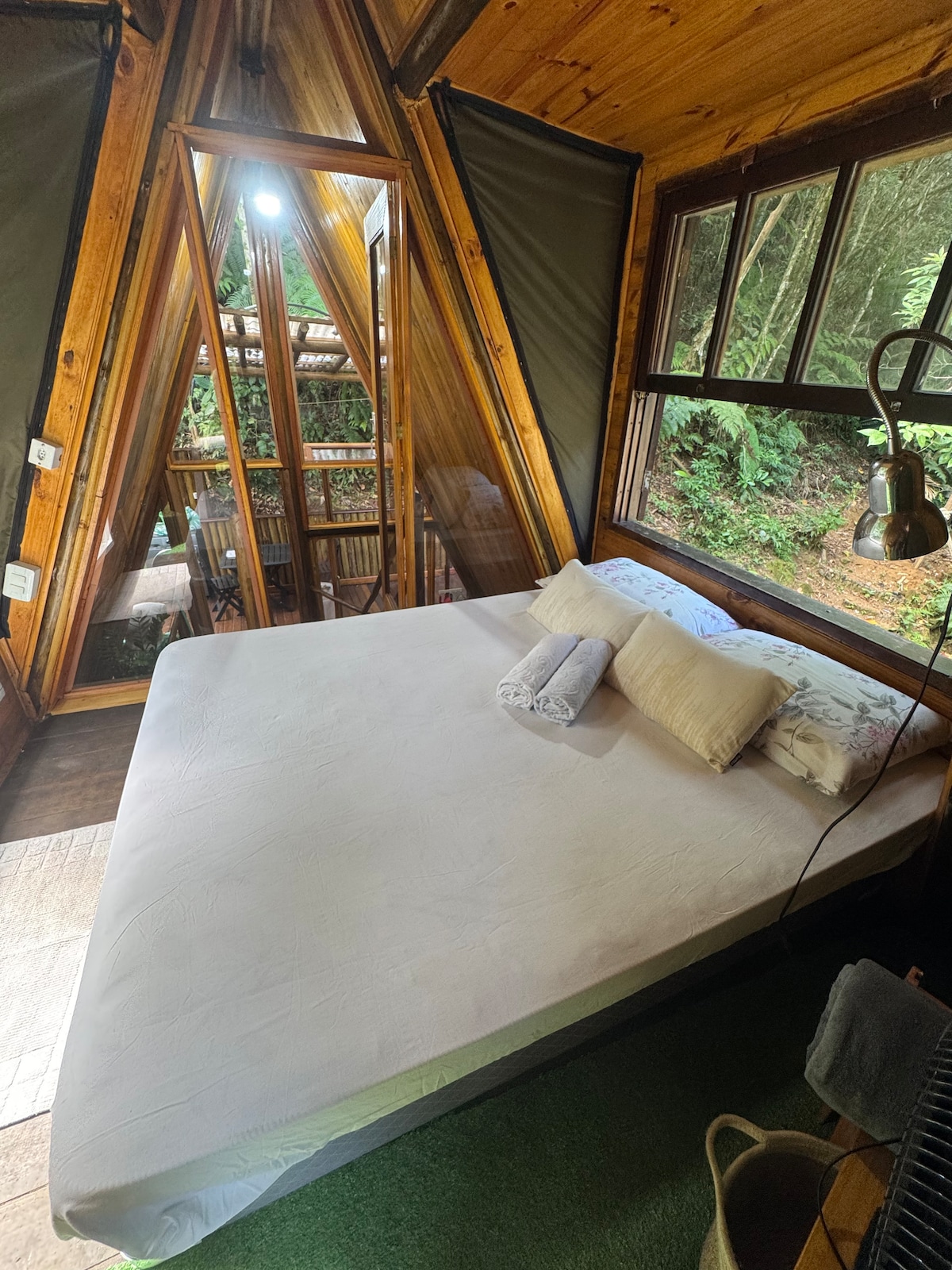 Construída em meio à natureza, cercada por uma exuberante mata, nossa cabana é um refúgio perfeito para você descansar e aproveitar a natureza com total segurança, conforto e privacidade. Além de uma vista 360º para a mata, sonoridade e acesso ao rio que corre pertinho, a cabana é equipada com lareira, cozinha completa, extensa varanda, rede e uma banheira com um visual único. Tudo cuidadosamente pensado para garantir uma experiência inesquecível.