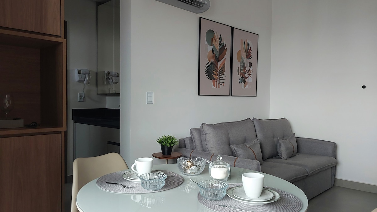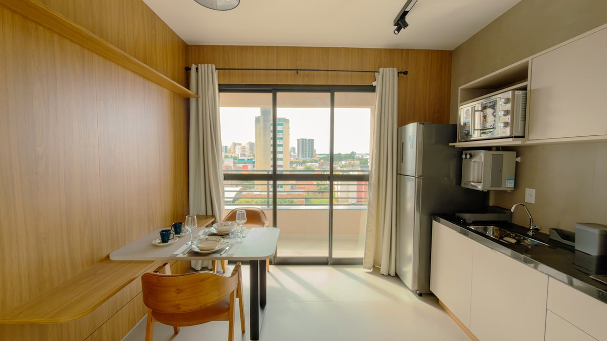 Studio Olive é completo e cheio de charme no 7º andar, com uma vista linda e ambiente acolhedor. A cama king é confortável com ar-condicionado e SmartTV que garante bem-estar. A cozinha está equipada com utensílios, liquidificador, airfryer, sanduicheira e cafeteira, porque aqui, cada detalhe importa. Ideal para até 2 hóspedes, o espaço oferece enxoval completo com toque de hotel boutique, pensado para quem valoriza conforto e praticidade.