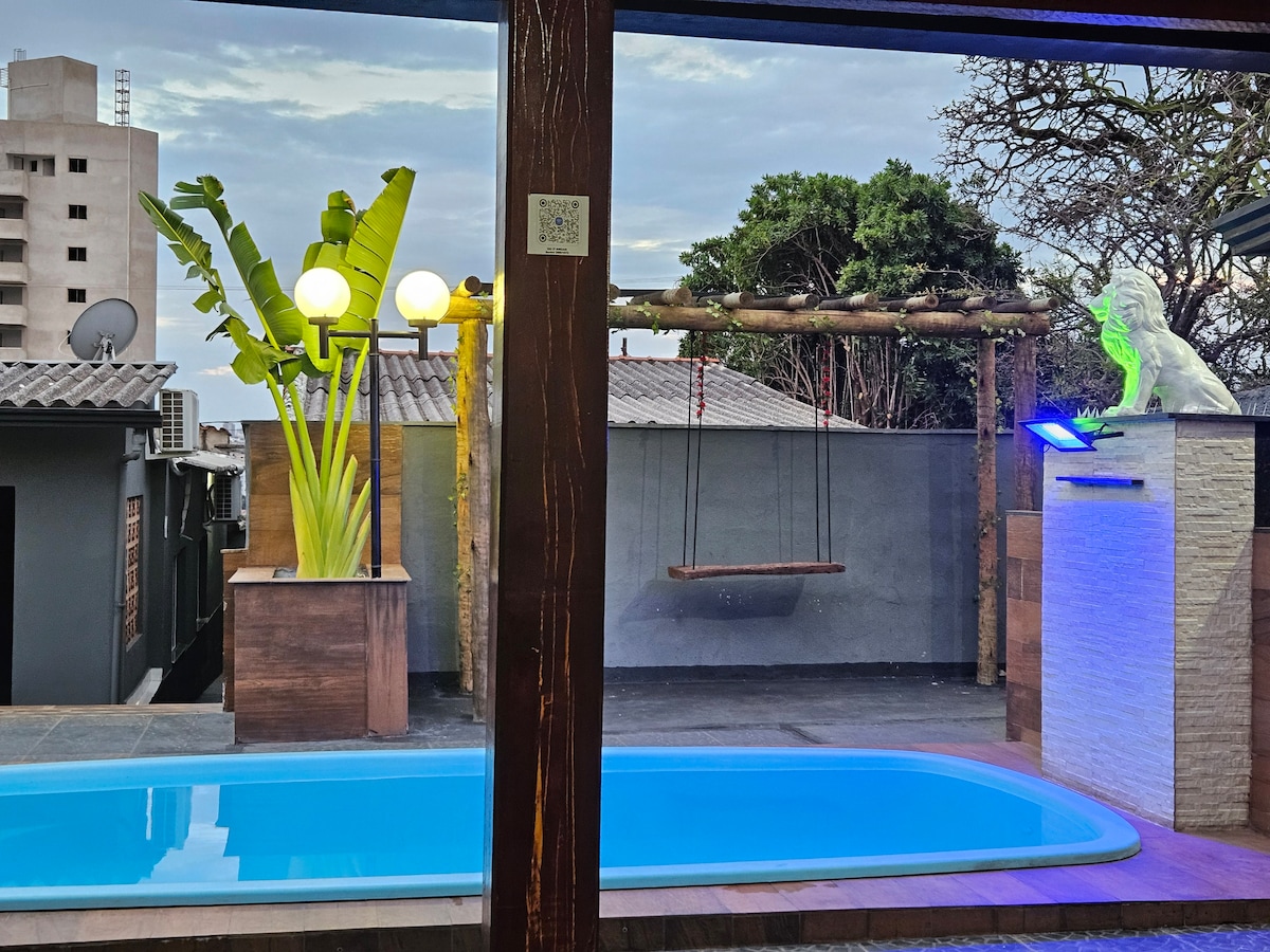 Um refúgio praiano dentro de Uberlândia! Lugar único na cidade, com uma experiência incrível de estar em contato com a natureza dentro da cidade. Local super espaçoso, com decoração rústica. O banheiro da suíte te conecta como se estivesse numa cachoeira, o quintal faz uma releitura de uma praia do litoral de São Paulo. Venha viver essa experiência!
