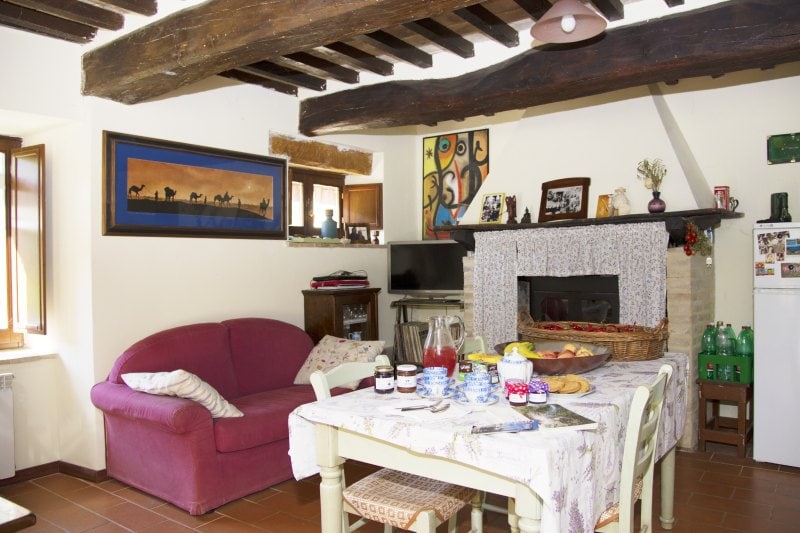 Escape to the rolling hills of Umbria in this updated farmhouse (90 m2 over 2 floors) that retains its original charm. The home features classic beamed vaulted ceilings, original stone finishes, an indoor wood-burning fireplace, private entrance and a private garden terrace. The shared pool has a large sun lounge area. If your favourite dates aren't available anymore take a look at our turquoise apartment. Turquoise: https://www.airbnb.com/rooms/plus/9430389.