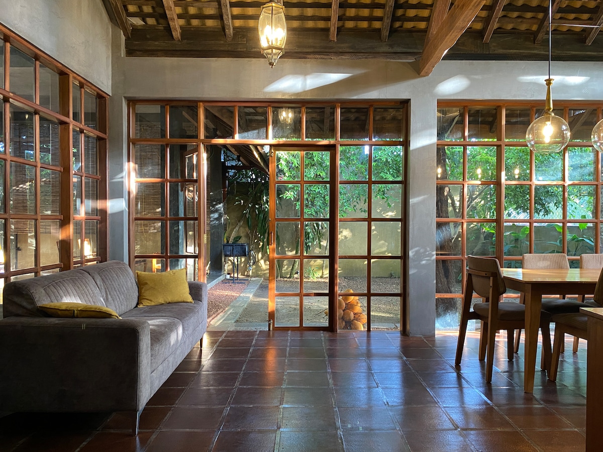 Cocoya is a working coconut and cinnamon plantation. Our house Sama means "Peace" in Sinhalese. It is designed to be a simple, open and spacious plantation home that connects with nature. It features an open living space, a kitchen and direct access to a 17m pool. Upstairs we have a master suite and junior bedroom that share a balcony with plantation views. Both have ensuite open-air showers. Guests enjoy a fully equipped kitchen and exclusive pool access. We do not have air-conditioning.
