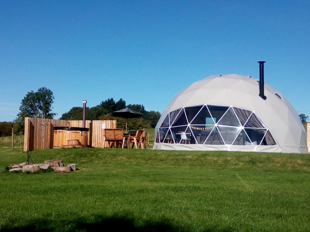 Geodesic Dome with wood-fired hot tub in the heart of Shropshire countryside. Situated in a 3 acre paddock on our family small holding. Getting around we would suggest you have a car or bike as there is no public transport or cabs. Please note we are a working farm so you will see and hear tractors during your stay. Our family are also keen equestrians so you will also see horses. There is also a Glamping Cabin in the field so you may see other guests during your stay.