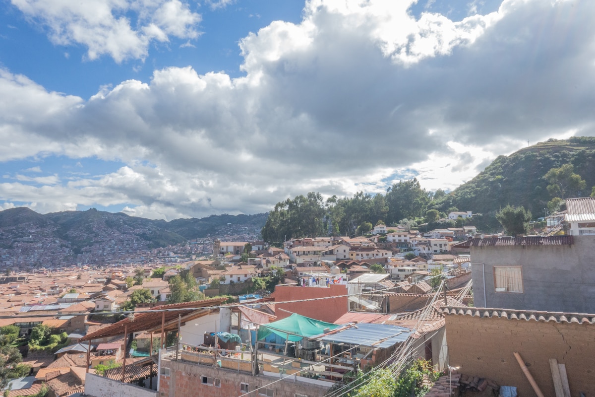 Your Apartment "Cusco" is our Apartment with spectacular City and Mountain views. The apartment includes with a Kitchen,Queen size bed, bathub with shower (2in1) chimney and a small eating area, cable tv and fast Wifi. With this room you have Wonderful views from the bathtub and bed over the city of Cusco! The City Center is a 5-10min walk from the Airbnb Daily Housekeeping included and Continental Breakfast