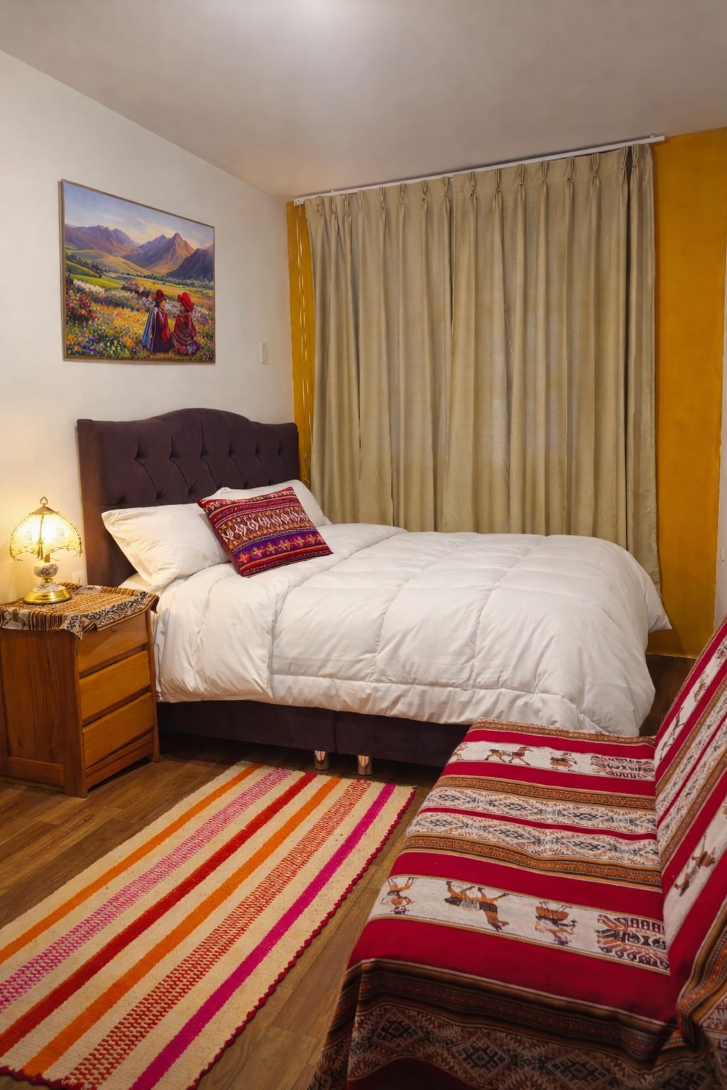 ubicado en el 3er piso este hermoso y Cálido departamento familiar, ha 6 minutos de el aeropuerto y ha 12 minutos del centro histórico del Cusco en vehículo, cuenta con cocina, baño con ducha de agua caliente, comedor, habitaciones bien amobladas, TV, WIFI.