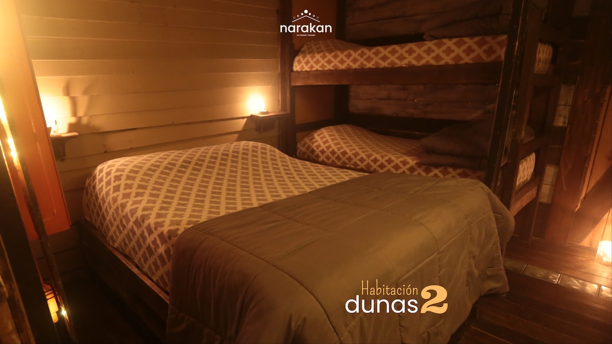 Frente al mar, en la Playa Calavera de Cabo Polonio. Una ubicación única, en donde el sol nace desde el mar generando las vistas más bellas. Un lugar mágico, para encontrarse, hacer amigos, divertirse o descansar. Hospitalidad y servicio amigable. Bar y servicio de comidas caseras. Ducha con agua caliente, Wi Fi y energía solar para cubrir las necesidades básicas sin afectar las vistas nocturnas del Cabo. Narakan Hostel “Donde nace la luz"