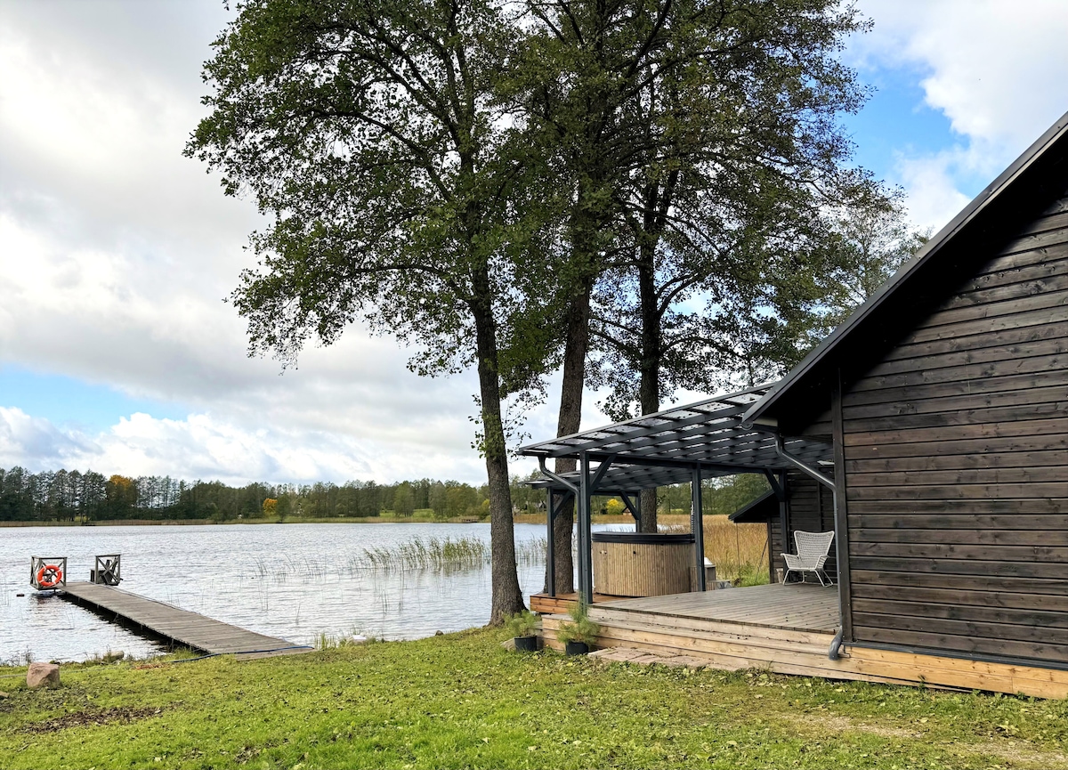 Šauni trobelė ant ežero kranto su pirtimi, kubilu