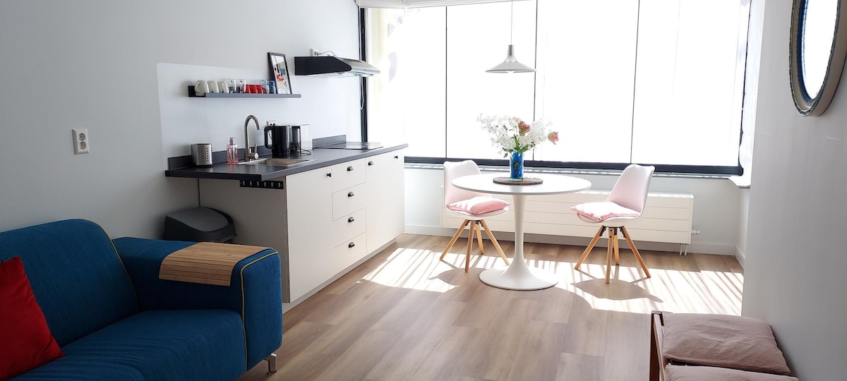 This 60 m2 apartment is ideal for couples on an Europe trip, it's a true home-away-from-home. And it's the perfect spot to explore the city of Utrecht from. Besides this it's also a perfect apartment for couples on a working holiday, because of the two separate work places, 1 in the bedroom and 1 in the living room. There's a strong wifi signal in both spaces, which makes video call's possible. This modern design apartment in a centuries old building (anno 1584) is in the centre of Utrecht.