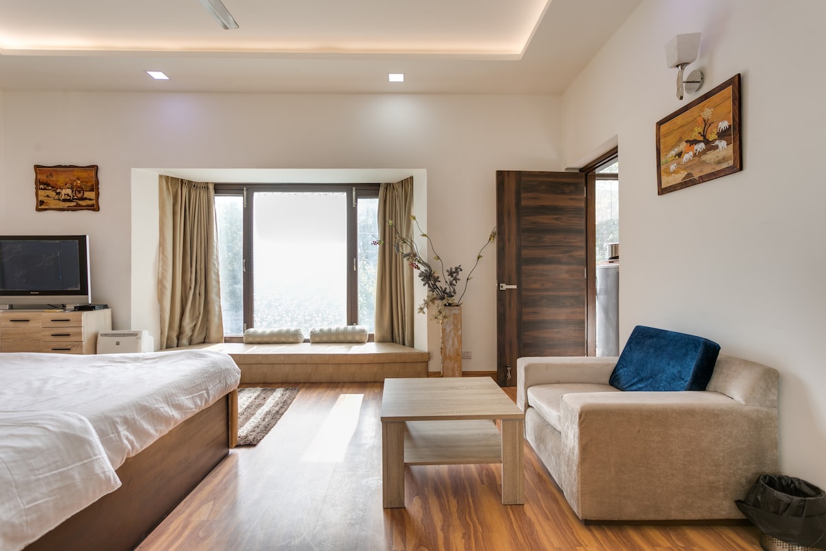 Nestled amidst the bustling Golf Course Road, yet offering a serene view of the Aravali forest range, this loft is a true urban oasis. Step into our spacious home with a living area, cozy dining area, and attached kitchen. Bedrooms offer rustic charm, comfy beds, ample storage, and access to peaceful terraces. A single bathroom is fully equipped. Enjoy views from two large terraces—one of the city and the other of the serene Aravali Forest, with a patio.