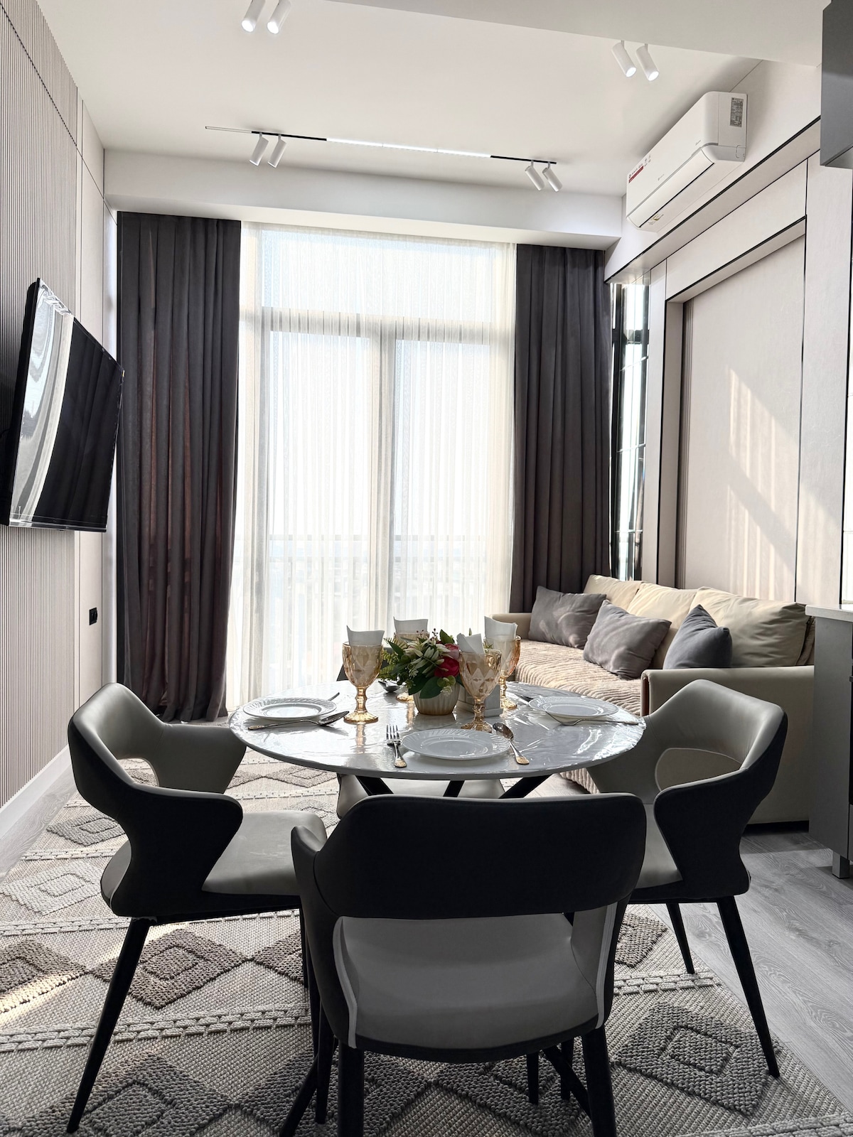 Современная студия в центре Ташкента — для работы и отдыха. Дизайнерский интерьер, уют, свет. Бесплатно для гостей: тренажёрный зал, коворкинг, смотровая с видом на Tashkent City, прогулочная и детская зоны. Рядом — рестораны, парки и деловой район. Идеально для бизнес-гостей и путешественников.