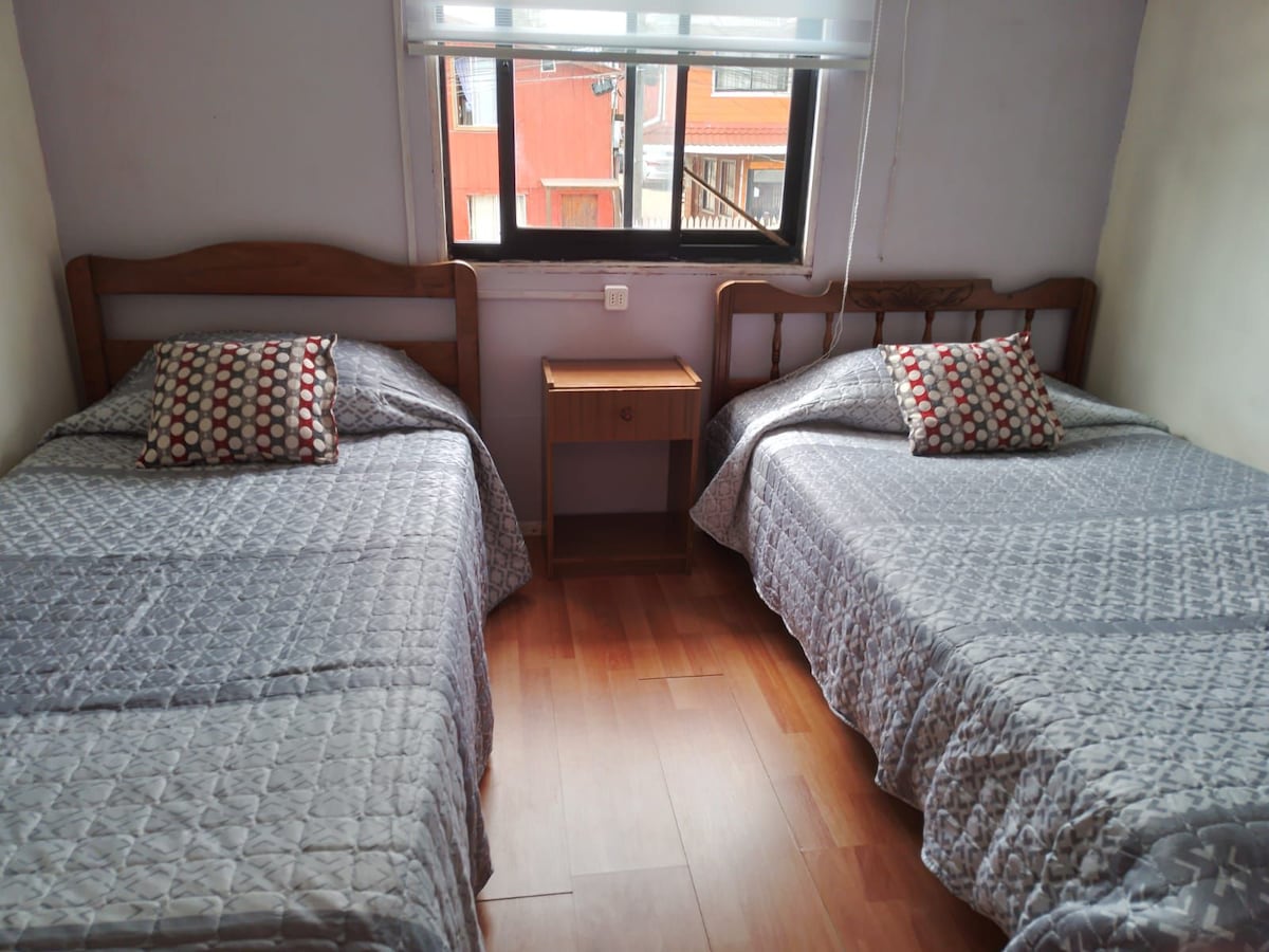 Pieza independiente para 1 o 2 personas. Cuenta con una cama matrimonial, baño privado, muebles de ropa, television, wifi. Además, cuenta con cocina independiente, refrigerador, hervidor de agua, vajilla y lo que necesitas para cocinar. La entrada es independiente, queda cercano a supermercados y locomoción que va a niebla fuera de la puerta. La distancia de la casa al centro de la ciudad es de 15 minutos en vehiculo o Uber $3500 o USD 3,5. Tenemos un perro que nos acompaña, muy jugueton